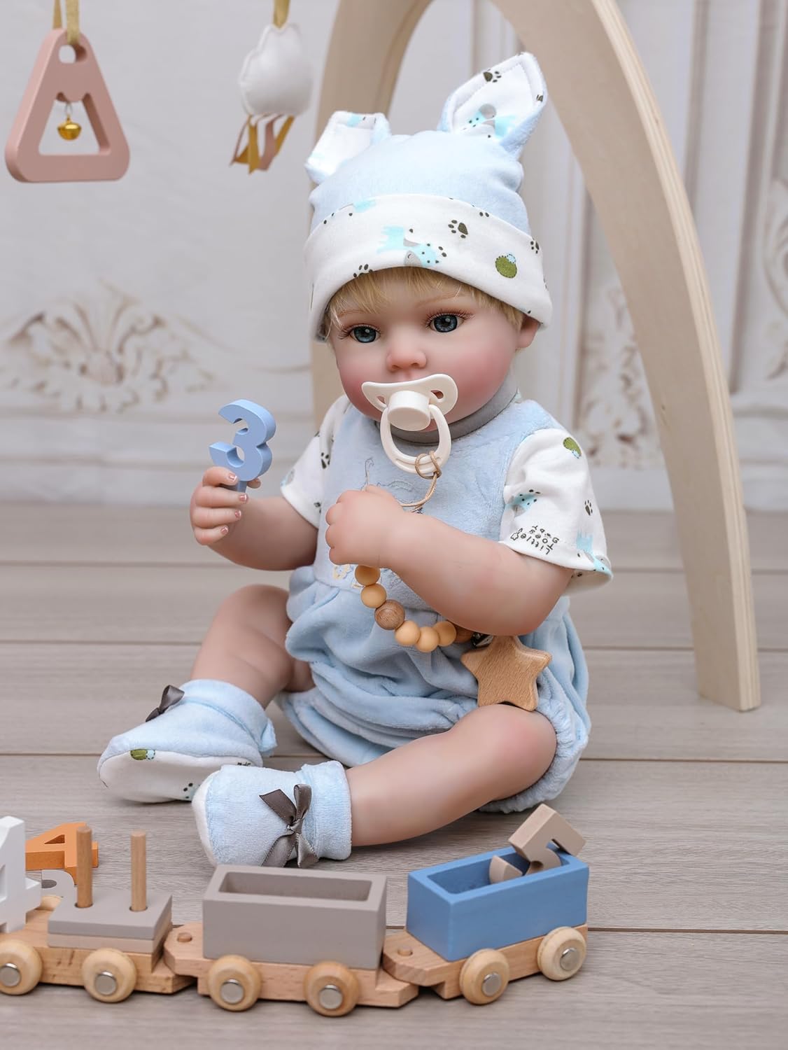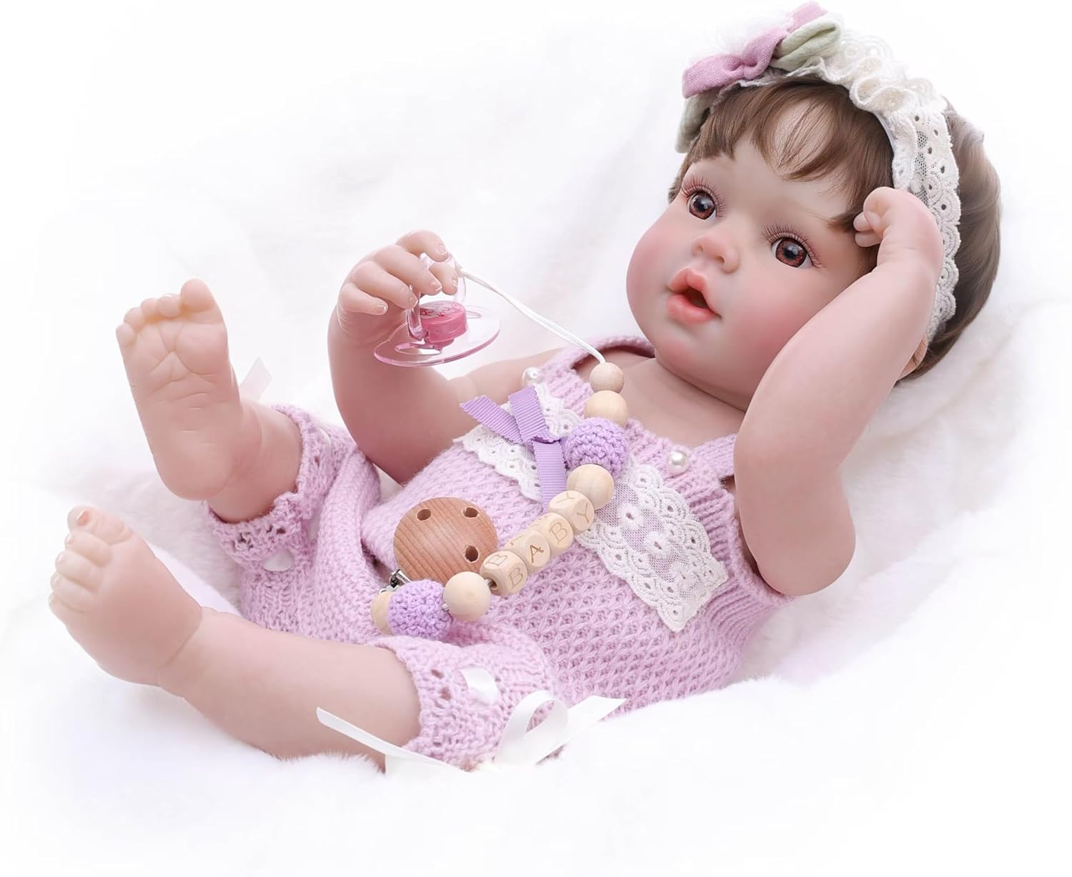 Dressed in Exclusive Elegance: She wears a beautiful lace-trimmed dress, complemented by a matching white headband and a charming oversized bow. Nestled lovingly in her arms is her ultra-soft plush lamb companion, featuring its own adorable pastel bow collar, completing a picture of timeless sweetness. Unrivaled Artisan Details: Beyond the sculpted form, discover layers of lifelike artistry. Silky hair is meticulously hand-rooted for a natural look. Captivating glass-like acrylic eyes gaze with wonder. Subtle rosy painted veins and baby-soft skin textures enhance the realism, while intricate details like tiny fingernails and perfectly wrinkled soles mirror the enchanting charm of a real infant. Gentle Poses for Cherished Moments: Designed for both display and gentle play, her poseable head and limbs feature smooth tilt/swivel joints. Easily arrange her in natural, heartwarming poses – tenderly kneeling, sweetly sitting, or lovingly cradling her lamb friend. This versatility inspires creative storytelling and allows for endless displays of affection. Unboxing & Gift: Your baby doll arrives in a gift box. Inside, you'll find a keepsake birth certificate, along with a soothing pacifier accessory. Crafted with the utmost care for safety and longevity, she is made from non-toxic, phthalate-free vinyl and dressed in hypoallergenic fabrics, ensuring peace of mind for child-safe play. Perfect For:Discerning collectors, unforgettable baby shower gifts, heartfelt christening presents, or as a centerpiece doll to cherish forever. This is more than a doll; it's a handcrafted heirloom imbued with extraordinary realism and love.