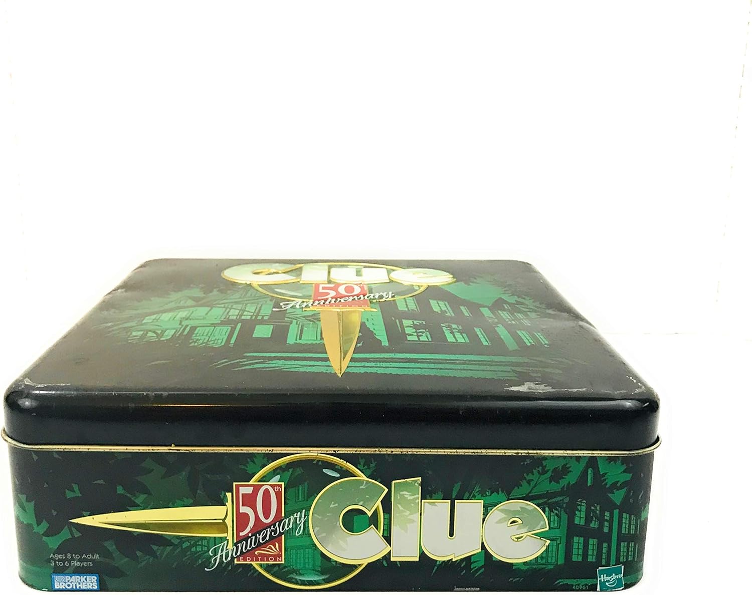 Product description Everything like new. Original pieces and instructions. Numbered gameboard in excellent condition. Some scoring sheets missing. Top lid has a denting and one scratch. Amazon.com Call the police! (Again!) The unfortunate Mr. Boddy has been showing up dead in his mansion ever since Anthony Pratt invented the game of Clue in England in 1944. Here's another chance for intrepid country-house weekenders like you to do him in (or have fun trying to figure out who did). In this 50th Anniversary edition, the 19-inch, square green board represents nine rooms in the Boddy mansion. The suspects are 1.75-inch metal figurines of Colonel Mustard, Professor Plum, Mrs. Peacock, and the late Mr. Boddy's other so-called friends. Other game elements include a die, a Clue card pack, and a pad for keeping track of suspects, locations, and weapons. The weapons are 1.5-inch-long metal models of a dagger, a pipe wrench, etc. Read the story of a weekend gone tragically wrong, and then set up the board and seek the awful truth. Just be sure to watch your back--unless, of course, YOUdunit. --Richard Farr