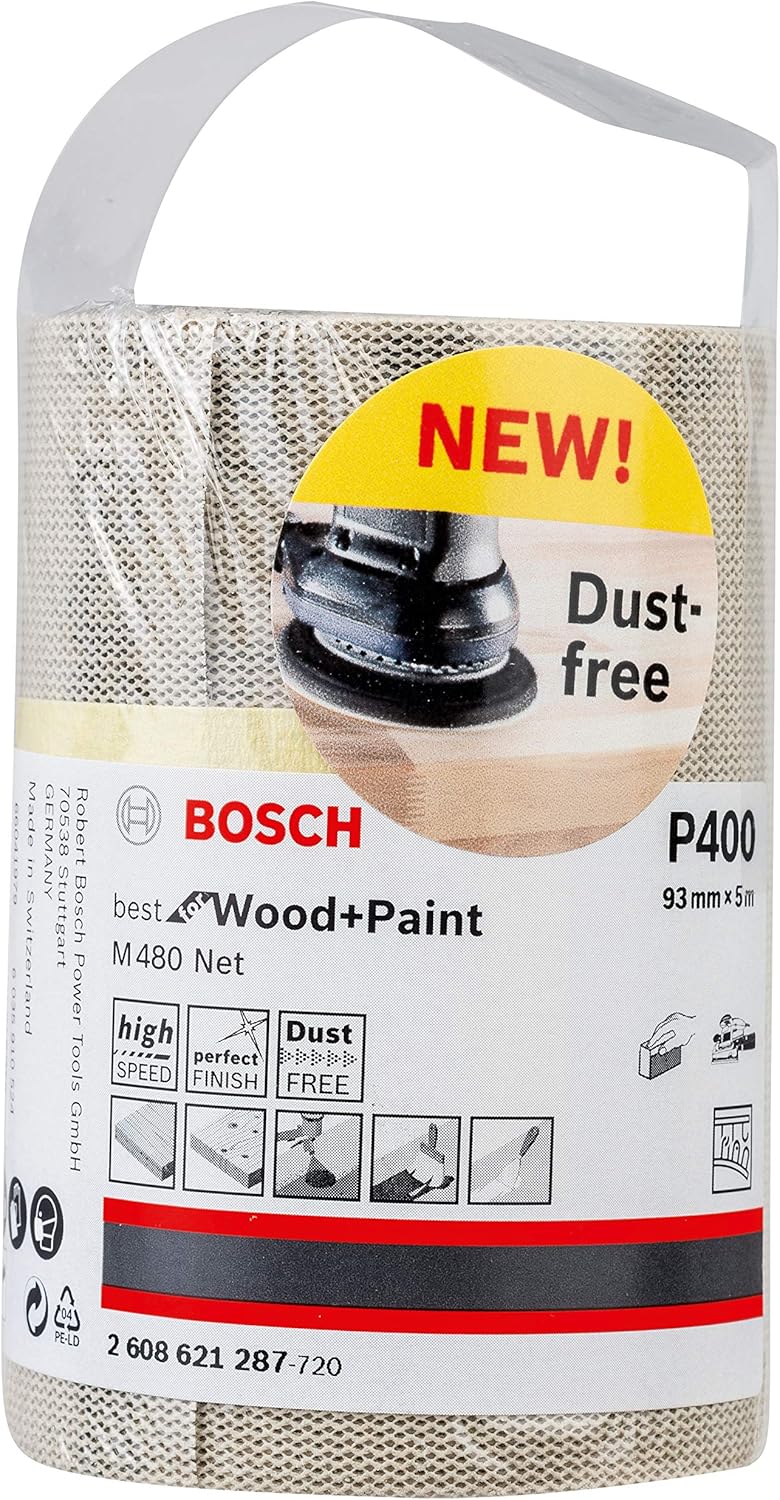 Fast sanding with enhanced results The fast and complete removal of the swarf created during sanding is essential in ensuring the ideal surface treatment. Bosch Professional sanding paper roll M480 ideal for wood and paint achieves this with an open net fabric structure that achieves a faster and cleaner result compared to conventional abrasives and that can also be achieved with less effort. Scope of delivery: 1 x Bosch Professional sanding paper roll M480 ideal for wood and paint – grit: P120, width: 93 mm, length: 5 m