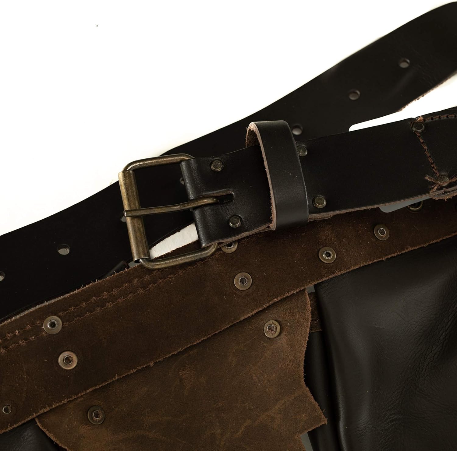 OIL TANNED LEATHER STANDS UP TO YEARS OF SERVICE WITHOUT CRACKING, RIPPING OR PUNCTURING. LARGE CAPACITY POCKETS FOR TOOL FASTENERS, SUPPLIES, NAILS. ROLLED EDGES STAND UP TO HEAVY USE. TWO ANTIQUE METAL HAMMER LOOPS. LEATHER WAIST BELT WITH ANTIQUE SINGLE PIN PRONG ROLLER BUCKLE. RIVET REINFORCED.