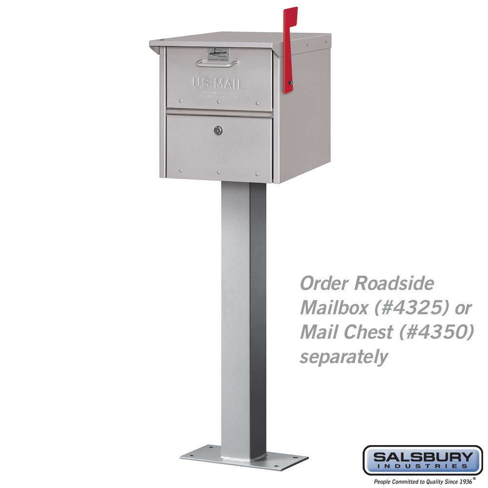 Product Description Mail Chest Pedestal, Color Silver, Height 32 In, Depth 3 1/2 In, Width 3 1/2 In, Bolt Mounting, Powered Coated Finish, For Use With G7424383, Post Material Aluminum, Post Thickness 1/8 In., Net Weight 20 Lb From the Manufacturer Salsbury Standard Pedestal Bolt Mounted for Roadside Mailbox and Mail Chest. Standard posts accommodate 2 wide and 3 wide spreaders to mount multiple roadside mailboxes and Mail Chest