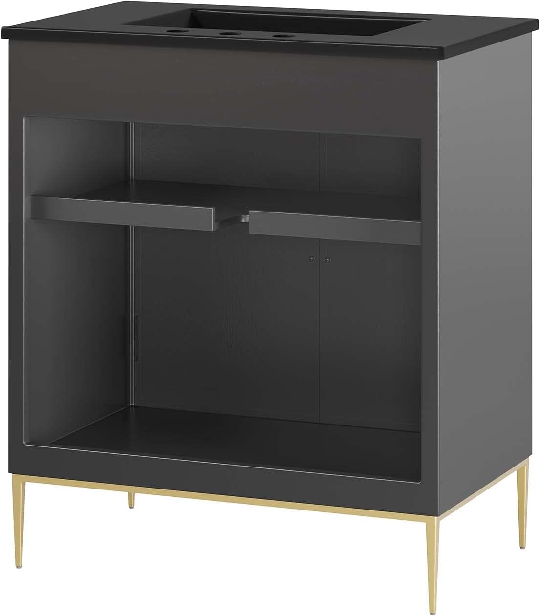 Intricate modernity radiates into your bathroom space with the Awaken 24" Bathroom Vanity. Showcasing clean lines arranged in a radial formation, this bathroom vanity is crafted with solid wood and MDF and rests on a gold base with non-marking foot pads to protect flooring. This vanity is a complete addition to a bathroom with a ceramic sink basin with an integrated countertop and 8" centerset holes. Offering ample storage space for bathroom essentials and more, this vanity cabinet features spacious shelves hidden behind detailed doors with sleek gold hardware. Fixtures not included. Assembly required.
