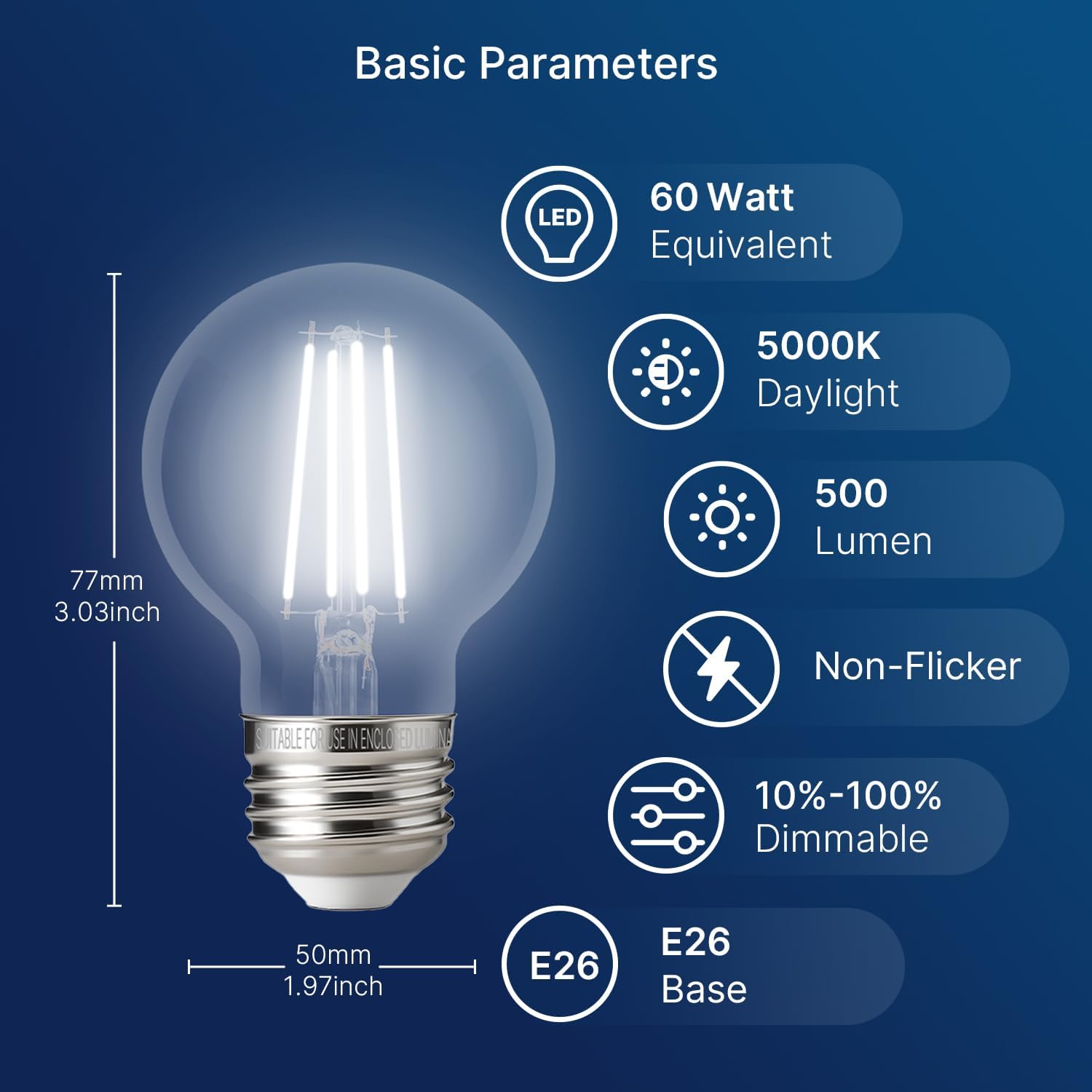 FLSNT 60W Equivalent LED Globe Candelabra Bulbs, Dimmable G16.5 LED E26 Chandelier Light Bulbs, 500LM, CRI82, 4W, AC 120V, 12 Pack, 5000K Daylight