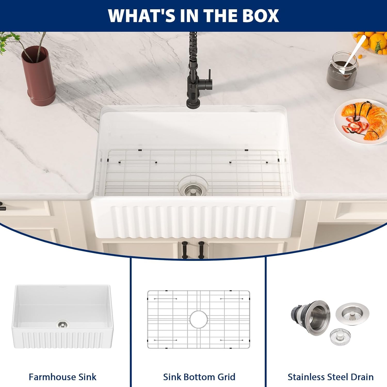 | Included Components | 30 inch farmhouse sink, Sink Bottom Grid,Stainlesss Steel Drain |