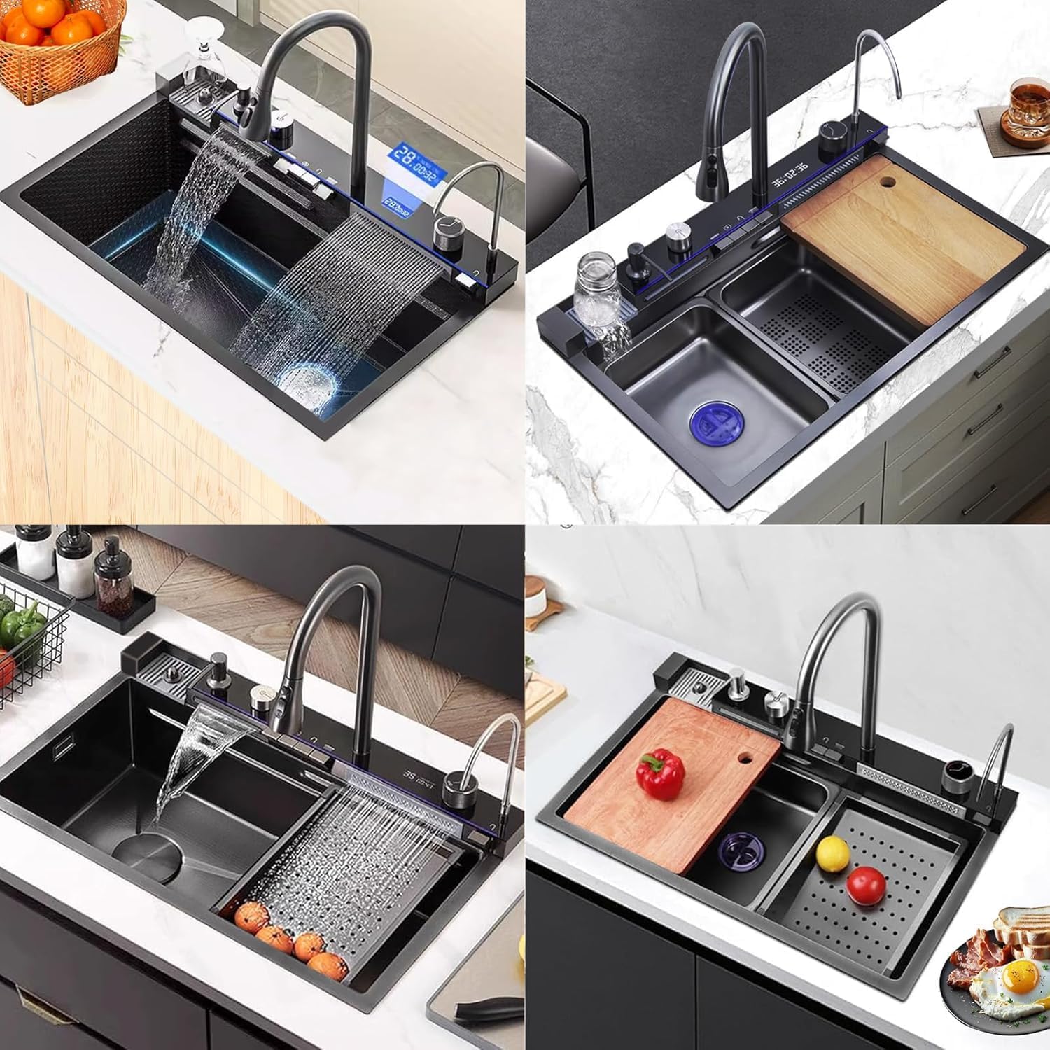 | Included Components | Stainless steel sink, Table-controlled drainage system, Multi-functional faucet, Vegetable basin, Wooden cutting board, Drainer basin, Pure water faucet, Glass Washer, Water inlet pipe,soap dispenser. |
