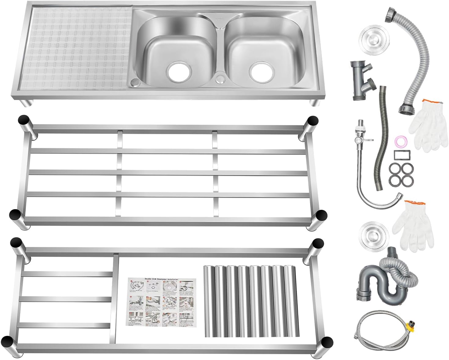 Description:With the double-basin design and high-quality material, this free standing stainless steel sink is a good cleaning assistant. Its enlarged and deepened basin not only alleviates the splash of water but also increases the use of space to handle large amounts of cookware. At the same time, the worktop nearby allows for placing objects or carrying out other work. Features:Easy to Install: Its simple structure and complete installation accessories allow you to easily complete the installation in a short time. Excellent Odor-resistance Performance: The drainage strainer intercepts food and debris for easy disposal and prevents clogging. You don't have to worry about being troubled by the unpleasant smell.Complete Set: This complete sink kit includes two water basins, a faucet, drain pipes, and a series of complete accessories.Raised Edges&Bottom: The raised edges can efficiently prevent overflowing, and keep your kitchen dry and clean. Specifications:Color: SilverMaterial: 201 Stainless SteelShape: RectangularStyle: ModernMounting Type: FreestandingAssembly Requirement: YesProcess: Wire DrawingBase Type: LegsFaucet Adjustable Angle: 360°Number of Basins: 2Number of Tiers:3Load-bearing Capacity: 100kg/200.46 lbsRound Tube Diameter: 47mm/1.85 inSquare Tube Width: 36mm/1.42 inBasin Size: 33*33cm/13*13 inWorktop Length: 40cm/15.7 inOverall Product Size: 120*45*80cm/47*17.7*31.5 inFirst Tier Height: 30cm/12 inSecond Tier Height: 34cm/13.5 inPackage Size: 124*50*35cm/48.82*19.69*13.78inGross Weight: 13kg/28.66lbsPackage Included:1* Free Standing Stainless Steel Sink 1 Pair* Gloves