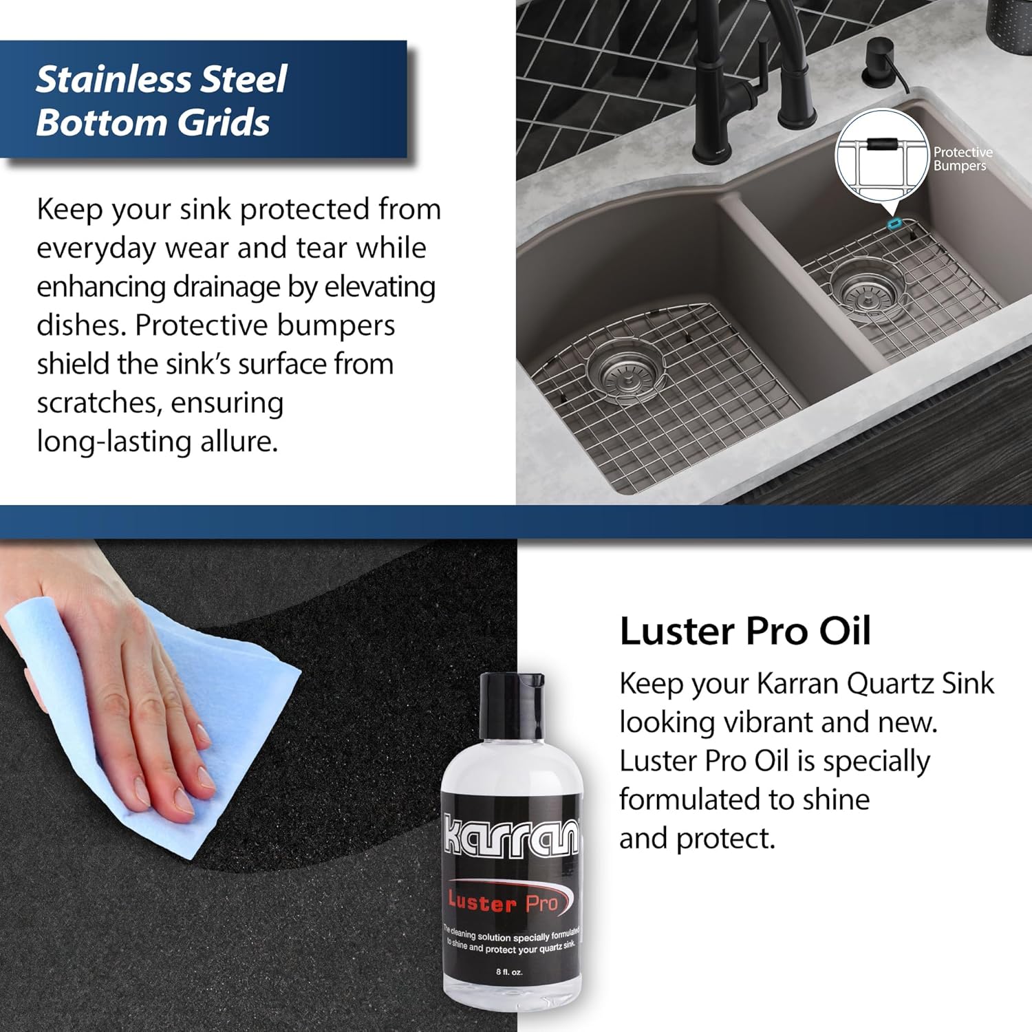 With its convenient large bowl and handy small bowl, this design is both functional and elegant. Karran quartz sinks are extremely durable and are engineered to stand up to the toughest daily kitchen tasks. This undermount design is available in a selection of 6 elegant color choices to compliment any d?cor. Features & Benefits Designed for installation under granite, quartz and solid surface countertops Made from 80% natural quartz crystals and pure acrylic resin Heat safe up to 535F and can withstand rapid temperature changes from hot and cold water Durable quartz material is non-porous, providing a smooth and easy-to-clean surface for lasting beauty and performance Smooth, non-porous material means food residue won't stick or stain the sinks surface Extremely stain, scratch, abrasion and impact resistant Quartz material absorbs vibration and minimizes noise when in use Natural quartz combined with pure acrylic resins provides deep, rich colors with a choice of 6 to choose from, and UV stabilization to keep those colors looking like new for years Regular cleaning is simple with just a cloth and soapy water Rear drain locations leave more storage room in your cabinet below and 9? deep bowls provide plenty of room to accommodate all your cookware Specifications Series: Quartz QU Series Bowl configuration: Large/small bowl Overall sink length (side to side): 32? Overall sink width (front to back): 21" Inside bowl dimensions: Left - 15-1/4" x 18-1/2" x 9" Inside bowl dimensions: Right - 12-3/4? x 16? x 9? Minimum cabinet size required: 36" sink base cabinet Drain opening size: 3-1/2? Compatible with most garbage disposals Approximate Weight: 31lbs Certifications: cUPC certified Accessories included with sink: Template and clips, 2x Bottom Grid, 2x Basket Strainer, 1x Luster Pro Oil