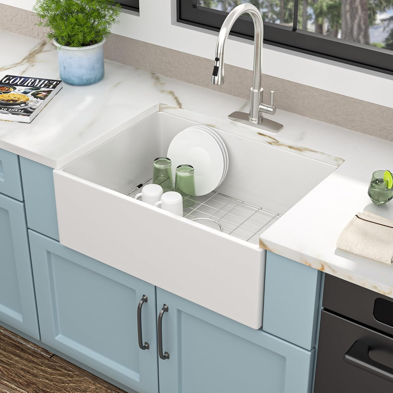 | Included Components | 33 inch farmhouse white kitchen sink workstation, acacia solid wood cutting board, bottom rinse grid, colander, roll up rack |