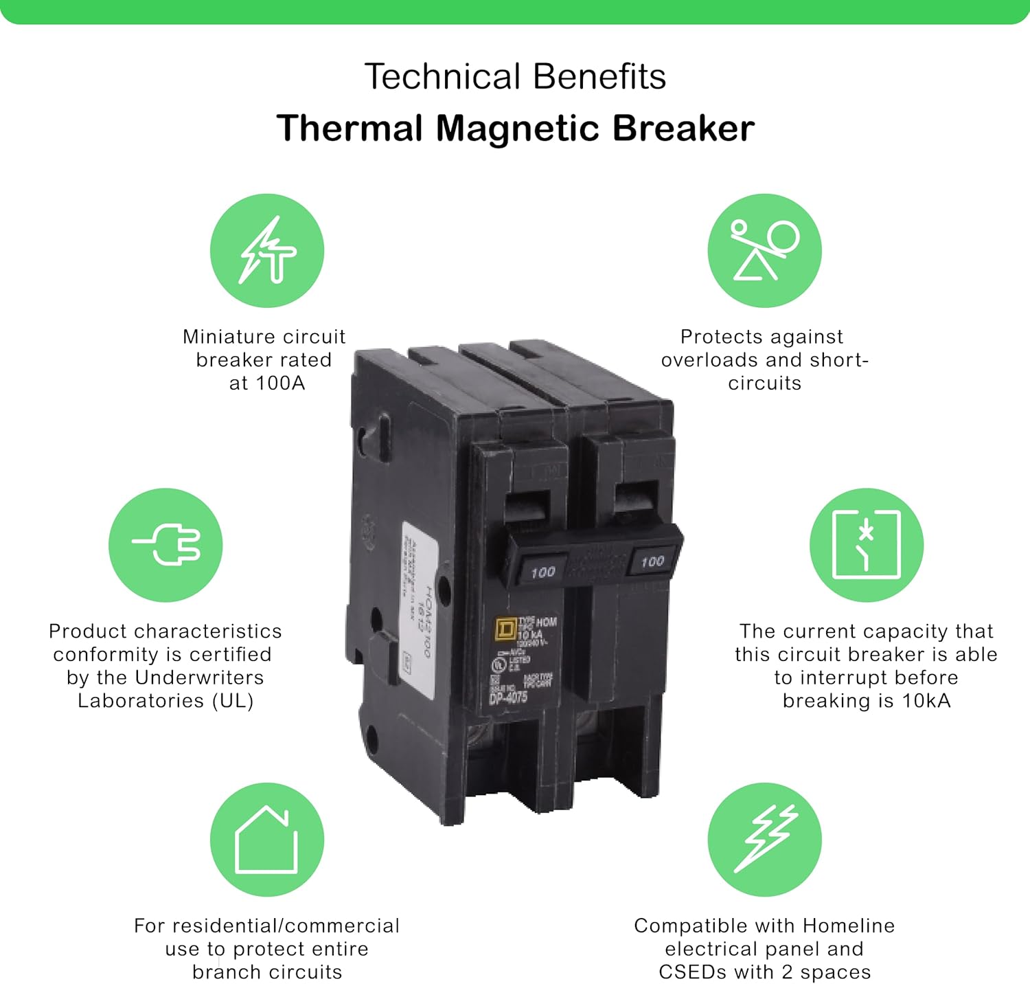 The Square D Homeline 100 Amp Circuit Breaker offers reliable residential circuit protection, safeguarding against overloads and short circuits. Designed for easy installation, its plug-on neutral design fits seamlessly into Square D Homeline load centers and CSEDs, taking up two spaces and allowing for a fast, hassle-free setup. This double-pole breaker operates on 120/240V AC circuits, commonly used for appliances which require larger amounts of power (clothes dryers, ranges, furnaces, air conditioners, etc.). Compact yet powerful, it features a 100A current rating, 10kA breaking capacity, and a space-saving design. UL-listed for safety and reliability, this circuit breaker is an essential addition to any residential electrical system. Dimensions: 3.13" H x 2" W x 2.98" D.