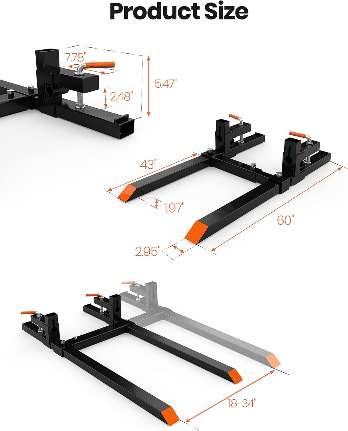 1500 LB capacity caliper pallet forks are compatible with most loader bucket tractors. Attach the fork to the bucket to easily move and transport heavy loads. It can carry loads up to 1500 LBS so you can carry a wide variety of items.