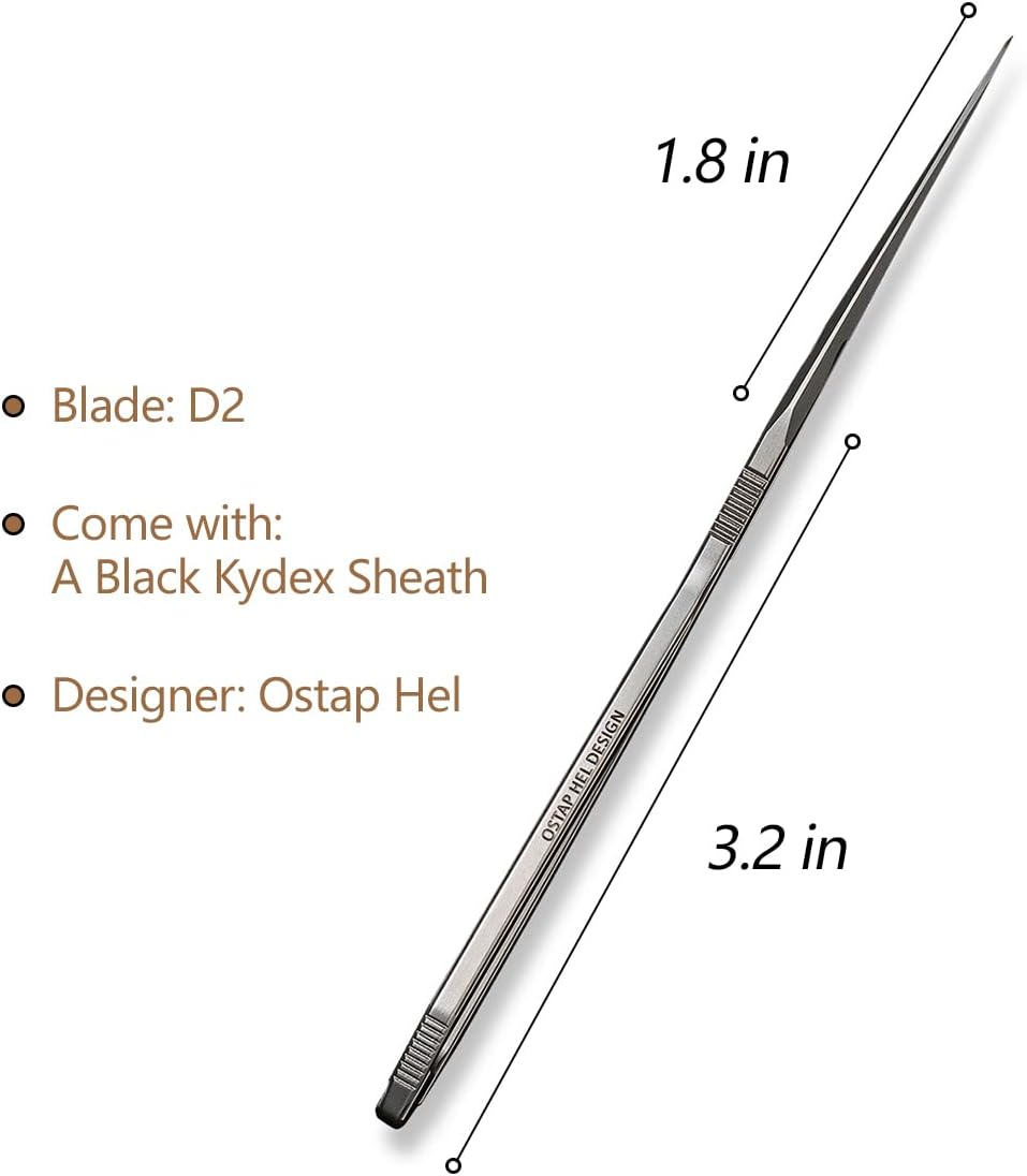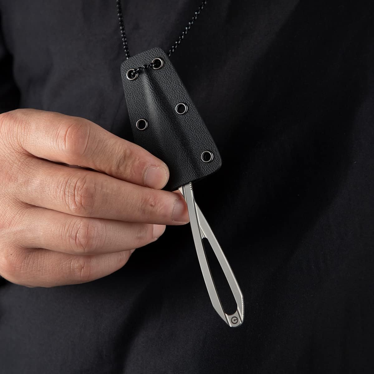 CIVIVI D-Art Neck Knife, Ostap Hel Fixed Blade with Kydex Sheath Specification: Overall Length: 4.94" / 125.5mm Cutting Edge Length: 1.74" / 44.3mm Width: 0.58'' / 14.7mm Thickness: 0.12" / 3mm Weight: 0.55oz / 15.7g Blade Material: D2 Blade Hardness: 59-61HRC Blade Grind: Flat Blade Finish: Silver Bead Blasted Sheath: Black Kydex Sheath Chain: Black Steel Designer: Ostap Hel Unique design of fixed blade, purchase and enjoy it.