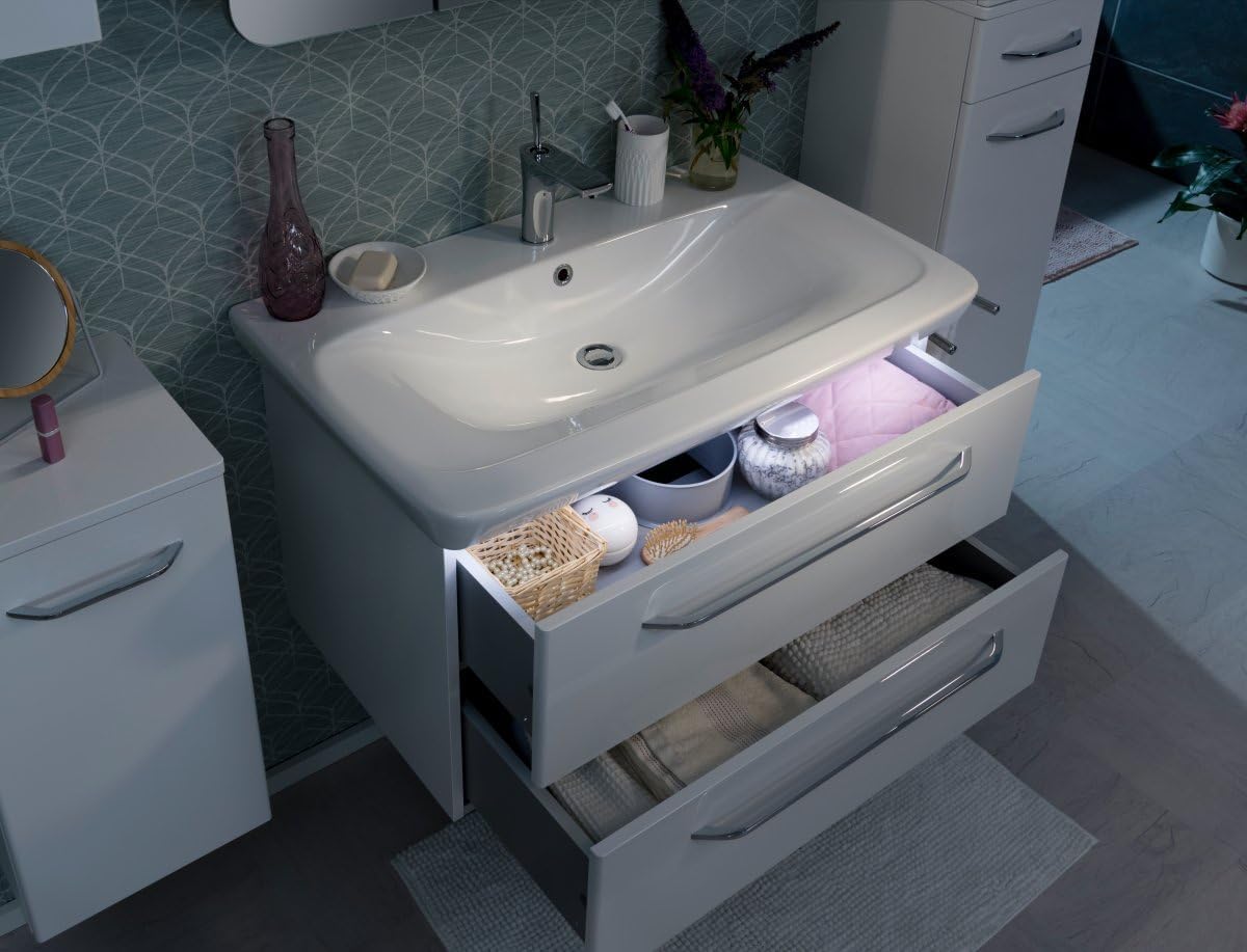 Fackelmann Milano Vanity Unit Milano is designed as a hanging program and can be installed as a wash area in just under 90 or 110 cm width as well as a guest toilet solution in 55 cm width. With the body and front there is a choice of classic white and natural branch oak wood decoration. The body and fronts are made of moisture resistant materials, stable and easy to clean. The basin cabinet with two drawers comes disassembled and comes with easy to follow assembly instructions (English language not guaranteed). The Milano ceramic washbasin (item no. 84200) and the LED lighting ConturaLight (item no. 80109) by Fackelmann. This ensures indirect lighting of the cabinet drawers. Basin and lighting are not included. Beautiful bathrooms are called Fackelmann. Contents: 2 x drawers, 1 x body. Body colour: white (matte) Colour (front): white (high gloss) The soft-close system ensures gentle closing of the drawers. Dimensions (W x H x D): approx. 80 x 49.5 x 48 cm. From bathroom to feel-good temple. Turn your bathroom into a paradise for all senses with the right furniture. Whether pre-assembled or disassembled for affordable self-assembly – Fackelmann offers a variety of furniture solutions. So your bathroom will become a real highlight and will have a special character. Let the bathroom furniture emphasise the individual style of your dream bath - and enjoy your own little spa oasis. Fackelmann has been producing bathroom furniture at Hersbruck since 1963. Thanks to decades of experience, we offer top quality and competent service.