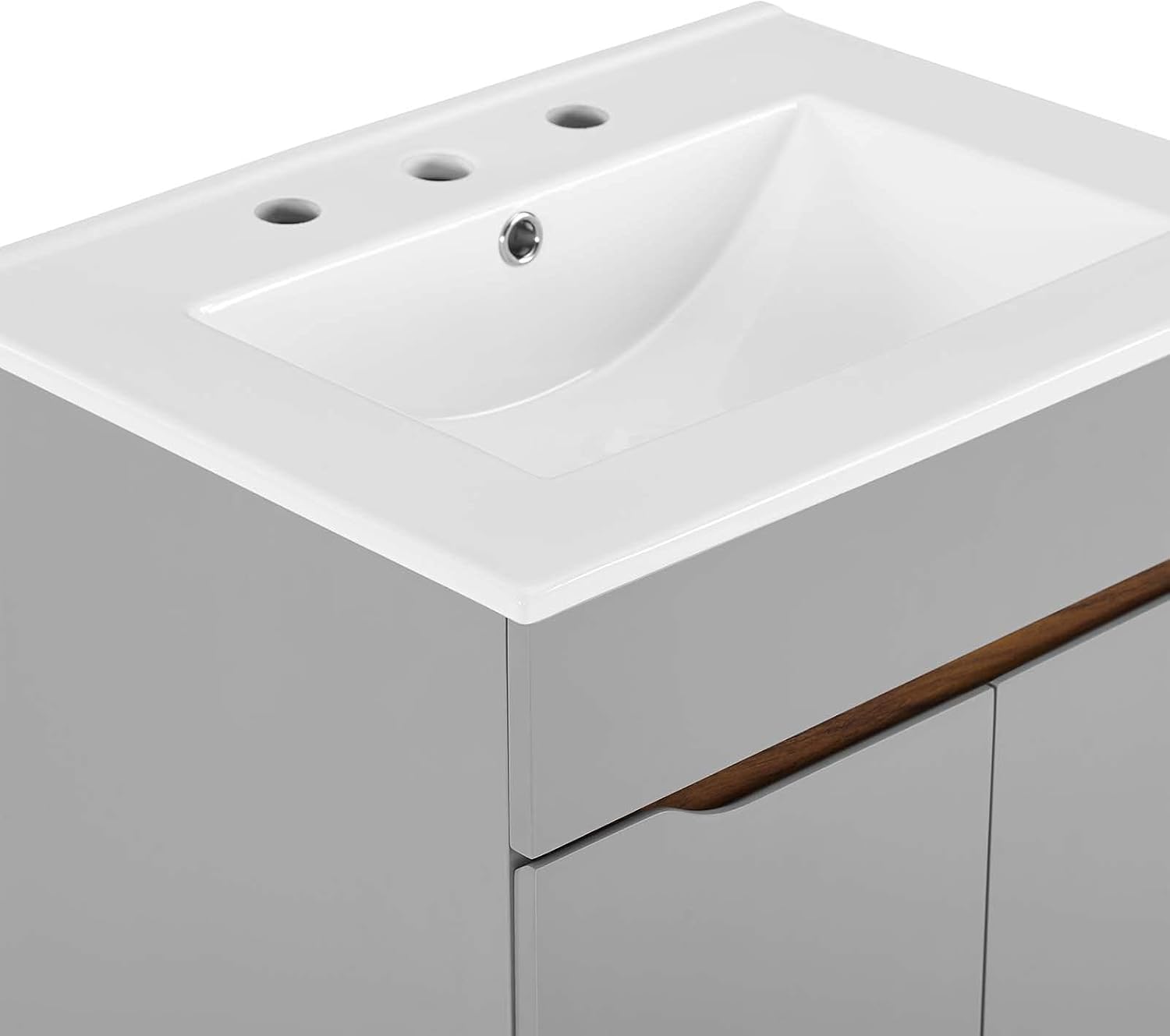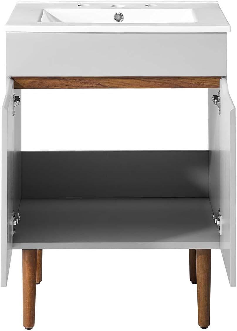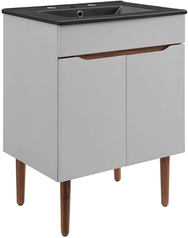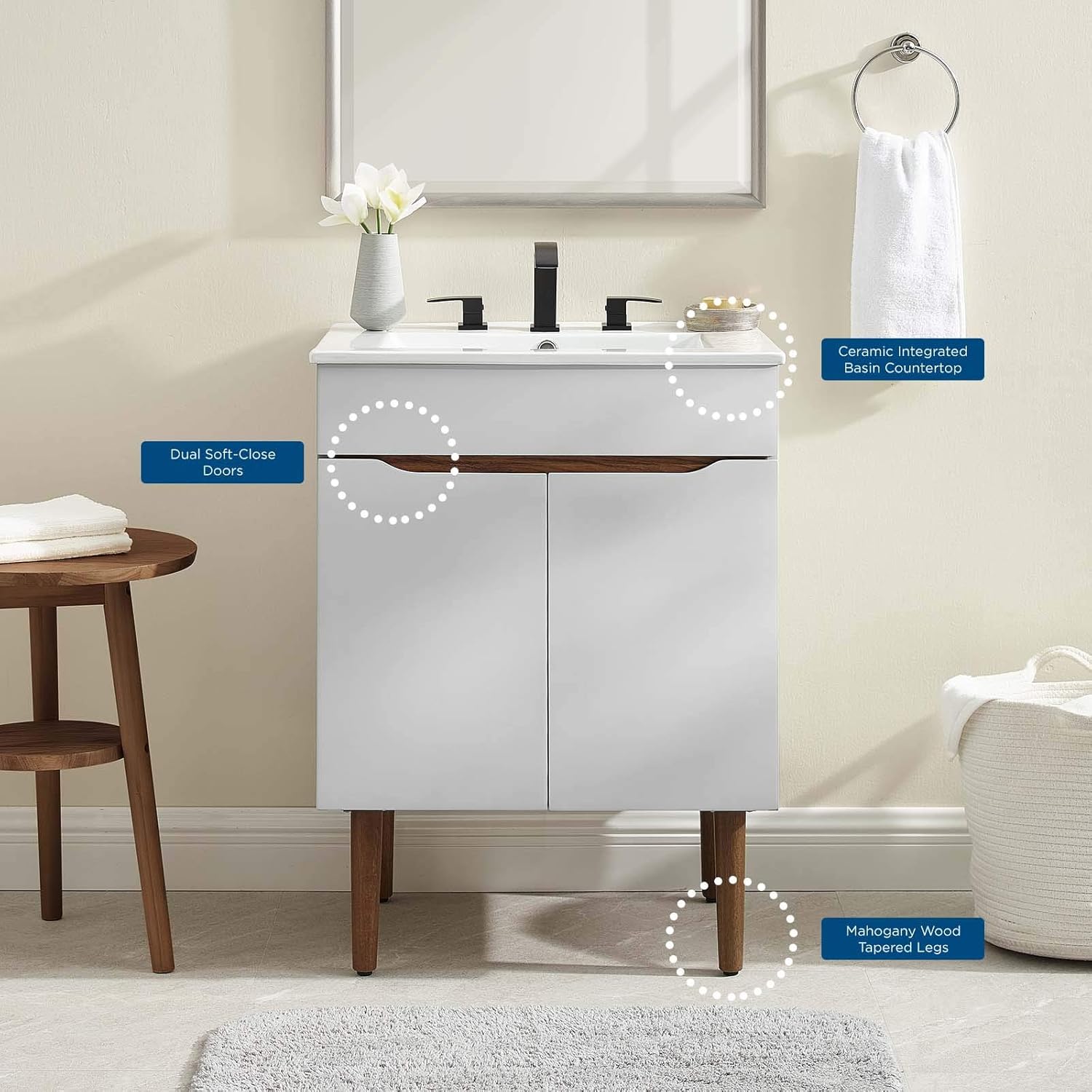 Instill the whispered elegance required to complete your bathroom decor with the Harvest Mid-Century Modern Bathroom Vanity. The Harvest Bathroom Vanity features a durable MDF frame with a matte finish laminate, four tapered mahogany wood legs, and adjustable storage shelf behind two soft-close hinged doors. An integrated countertop and ceramic sink basin continue the sleek look with Scandinavian modern style design for a quietly bold vanity designed for a multitude of decor styles. This vanity features solid construction with a cutaway design on top of the dual doors for easy open and close functionality. Assembly required and fixtures not included.