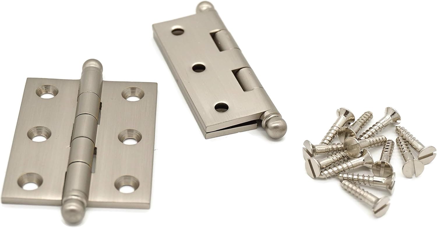 These beautiful and well made small hinges is an excellent choice for cabinets, cupboards, hutches, boat cabinets and more. Add the finishing touch to your wood working project or restoration repair. Finely crafted from high strength extruded heavy gauge solid brass (3/32" leaf thickness) with brushed nickel finish. Its Brass Base means these hinges will not rust and is ideal for outdoor applications. Comes with 12 solid brass, brushed nickel finish, slotted finishing flat head wood screws.---- Sold in pairs. ------------------------ Dimensions: Hinge Width (including knuckle); 1-3/4" x 2-1/2" High; Leaf Only: 11/16" Wide x 2 1/2" high; Overall Height from Ball Tip to Ball Tip: 3-1/4".
