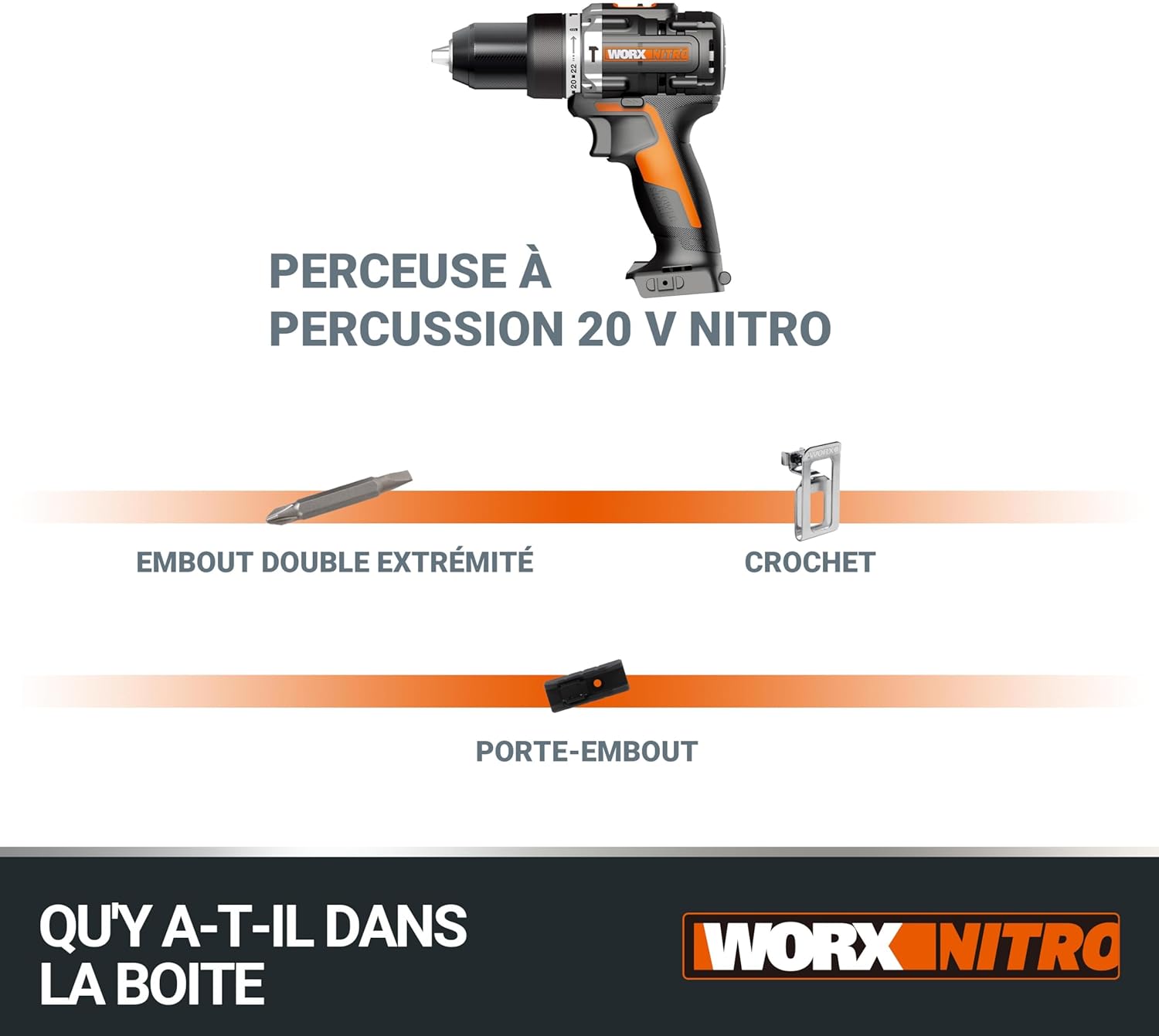 WORX NITRO Brushless 20V Cordless Impact Drill - WX352.9 - 60NM -φ 13mm (2 Speed, LED Lighting, Supplied Without Battery or Charger, Accessories and Case The WX352.9 Impact Drill (Version Without Battery or Charger) has everything you need to do all your drilling work at home. This 20V cordless impact drill is compact and lightweight allowing you to go through tight spaces and provides optimal comfort even over prolonged use. Featuring a robust 13mm chuck, it is suitable for demanding jobs and will allow you to drill in many materials such as brick, concrete, plasterboard, PVC, wood and metal. All gears and housing are made of metal giving it greater durability. With a torque adjustment of 22 + 1 + 1 which produces a maximum torque of 60 Nm, you will find the perfect setting for your job. Powerful, the WORX WX352.9 Cordless Impact Drill features a no-load speed of 0 to 450/0 at 2000 rpm and an impact rate of 0-32,000 bpm. Its powerful brushless motor (carbon free) converts energy into power 50% more efficiently and lasts longer than a conventional motor (with coals). Technical features: - Battery type: 20 V - 2Ah (battery and charger not included in the WX352.9 version) - No-load speed: 0 to 450/0 at 2000 rpm - Impact rate: 0 - 32,000 bpm - Tightening torque: 22+1+1 torque positions - Maximum torque: 6 0Nm - Max. Drilling capacity: wood: 40 mm, steel: 13 mm, brick: 12 mm, masonry: 12 mm. - Chuck capacity: 13 mm. - Weight: 1.5 kg (with battery) Delivered with: - 1 x WX352.9 - 1 x Double end cap - 1 x Bit holder and belt hook - 1 x Worx storage case is a registered trademark of the International Positec group, Positive technologies having to its credit more than 6000 patents registered in the production and creation of innovative tools in the DIY and gardening sector. At Positec, we are here to offer you the best of technology, thanks to products intelligently designed to facilitate your daily life but also allow you to realize your projects. Innovative concepts, sustainably manufactured to leave a better world for future generations. Our products are designed to last – benefit from a 2 year warranty as well as an additional 3 years extension on power tools under conditions of registration of your product on the WORX -Europe website by registering your product within 30 days of your purchase (excluding robots mowers warranty 2 years + 1 year free, excluding accessories warranty 6 months, excluding batteries and chargers - 2 year warranty)) The satisfaction of our customers is one of our highest priorities. For any questions or advice contact us on our social networks "WORX France" or on our worx website. We will advise you on the most suitable product for your project or solve your problems.