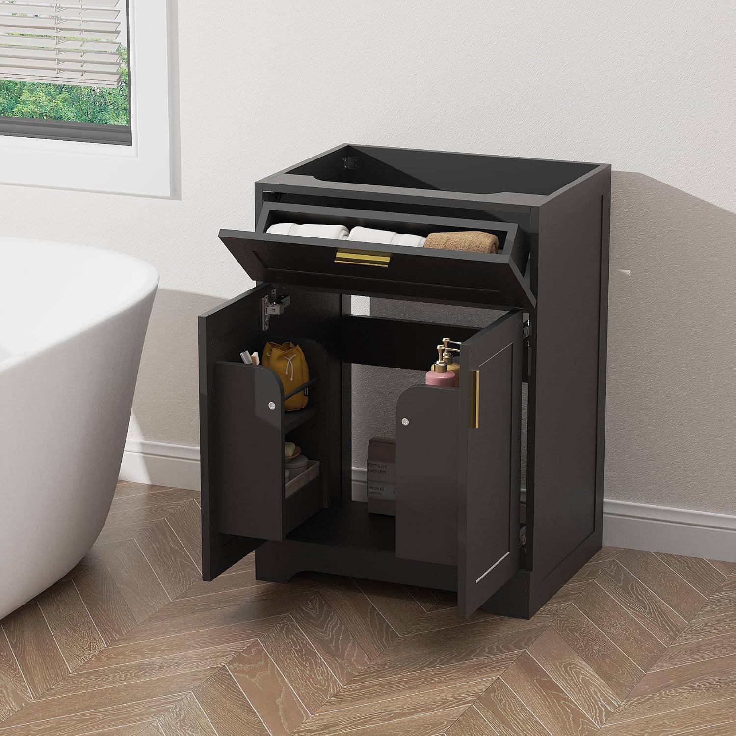 Introducing the YOCONYO Bathroom Vanity with Ceramic Sink, a sophisticated and practical addition to elevate your bathroom. This beautifully crafted wood vanity features a durable ceramic sink and offers ample hidden storage, providing a perfect blend of style and functionality for your bathroom space. The integrated sink and cabinet combo set creates a seamless, cohesive look, making it an ideal choice to enhance the aesthetics of any bathroom. Available in three timeless colors - White, Grey, and Black - the YOCONYO Bathroom Vanity complements various interior design themes, adding a touch of elegance to your bathroom decor. Designed with a painted surface finish, this vanity exudes a sleek and modern appeal, making it a versatile choice for any bathroom setting. Upgrade your bathroom with the YOCONYO Bathroom Vanity, where superior craftsmanship, practical storage, and stylish design converge to offer you a premium solution for your bathroom needs. Redefine your bathroom space with this sophisticated and functional vanity that combines quality, style, and convenience.