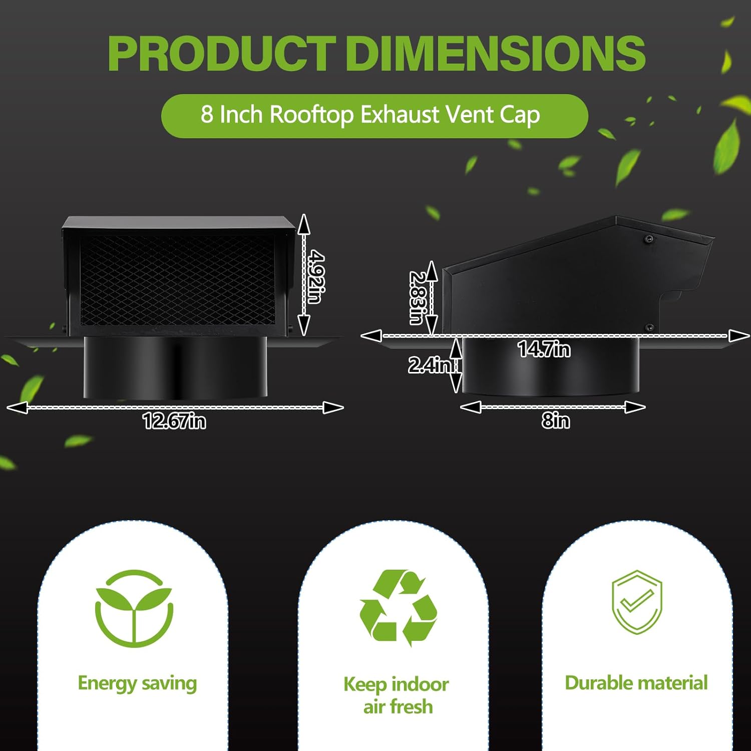 Features: Designed to accommodate an array of ventilation systems, this outdoor exhaust hood cap introduces a level of flexibility. Whether applied in a kitchen, bathroom, or laundry vent system, this vent cap will always ensure efficient air distribution. Specifically tailored for cross ventilation systems, this roof vent cover cap can be particularly effective for regulating indoor air quality. Its advanced system allows it to cater to specific ventilation needs that ordinary roof vent caps may not be able to handle. Reinforce your building's ventilation system with this efficiently designed roof vent cap. Specifications: Material: steelColor: blackSize: Suitable for 8 inches hosePackage includes: 1 x Roof vent cap Notes: Manual measurement, please allow slight errors on size. The color may exist a slight difference due to different screen displays.