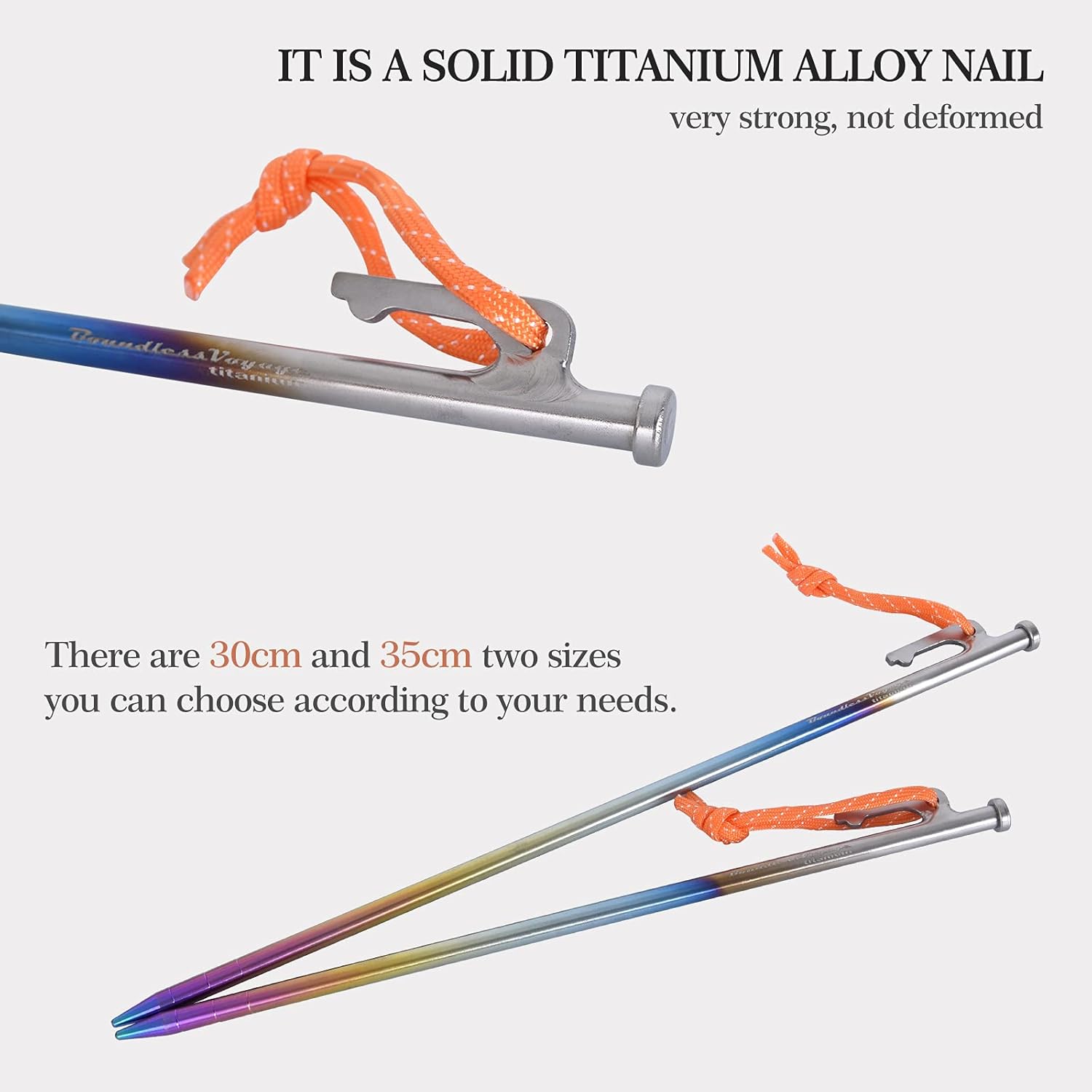 Titanium alloy Tent Stakes PegsModel: Ti4015PMaterial: Titanium alloyColor: primary titanium colorModel: Ti4016PMaterial: Titanium alloyColor: high temperature calcined colorDimensions:①Size: about Φ8x 300mm①Weight: about 70g/per②Size: about Φ8x 350mm②Weight: about 83g/per③Size: about Φ8x 240mmWeight: about 57g/perFeatures:Penetrate and hold firmly in a wide range of soil conditions.The tent stakes provide enough holding power on ground.Titanium is lightweight and stronger than steel. Durable, lightweight, heat resistant and non-magnetic.- Place of origin: China- The price of our product is without customs fee!