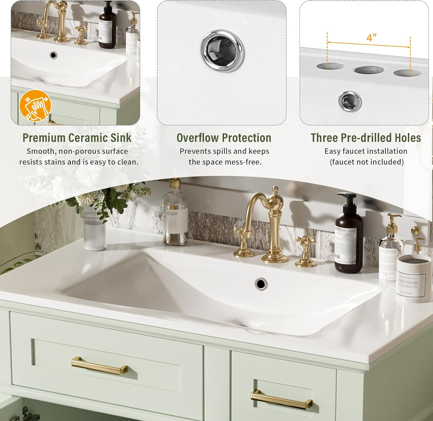 30" Bathroom Vanity with Ceramic Sink; Modern Storage Cabinet; Soft-Close Doors & Drawers Space-Efficient Luxury: Designed for compact bathrooms, this Vietnam-crafted vanity combines a ceramic sink with smart storage solutions. The white solid wood+MDF cabinet supports 200 lbs total weight, featuring 2 soft-close doors and 2 drawers (50 lbs/drawer capacity). Free-standing design requires no wall mounting. Precision Engineering: - Overall: 30"W x 18"D x 34"H; 94.8 lbs total weight - Sink: 30"W x 18"D x 6.3"H (31.8 lbs) with overflow - Cabinet: 29.2"W x 17.2"D x 33.5"H; 63 lbs Technical Specifications: - Style: Mordern (contemporary aesthetic) - Materials: Ceramic Sink + Solid Wood/MDF Cabinet - Mounting: Free-standing - Faucet: 4" centerset holes (faucet not included) - Storage: 2 doors + 2 drawers (1 deep/1 standard) - Edge: Flat 0.5" thick ceramic top Why This Vanity? ✔️ Ships in 1 box (ready for DIY assembly) ✔️ Scratch-resistant painted finish ✔️ Undermount/drop-in sink flexibility ✔️ Quiet soft-close mechanisms