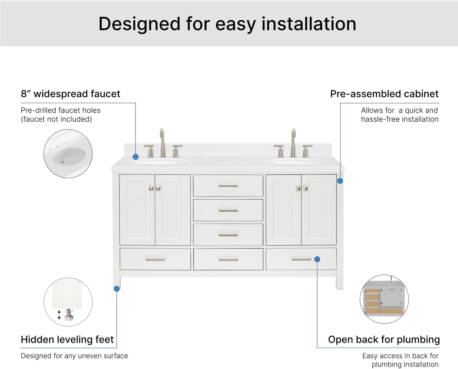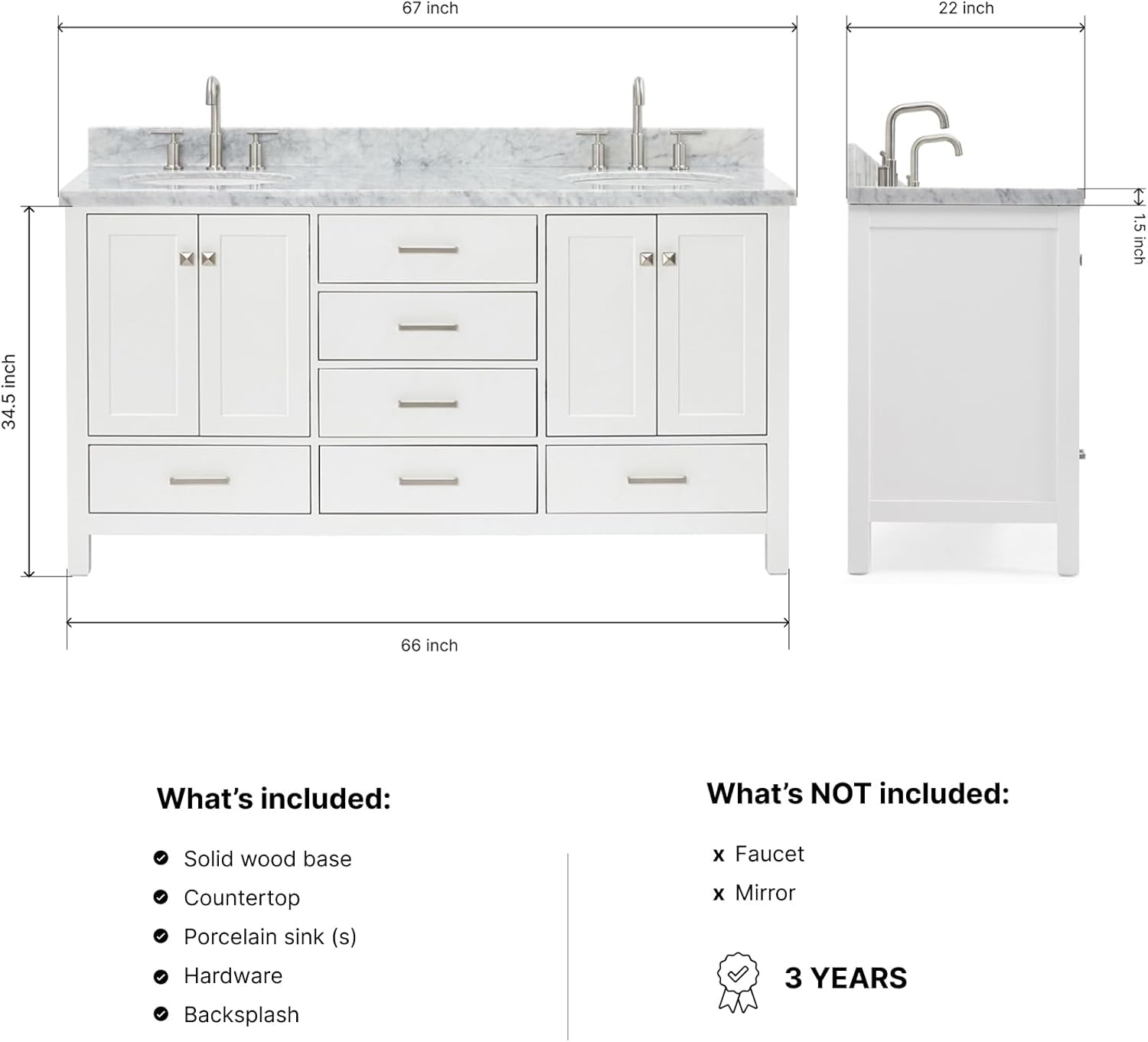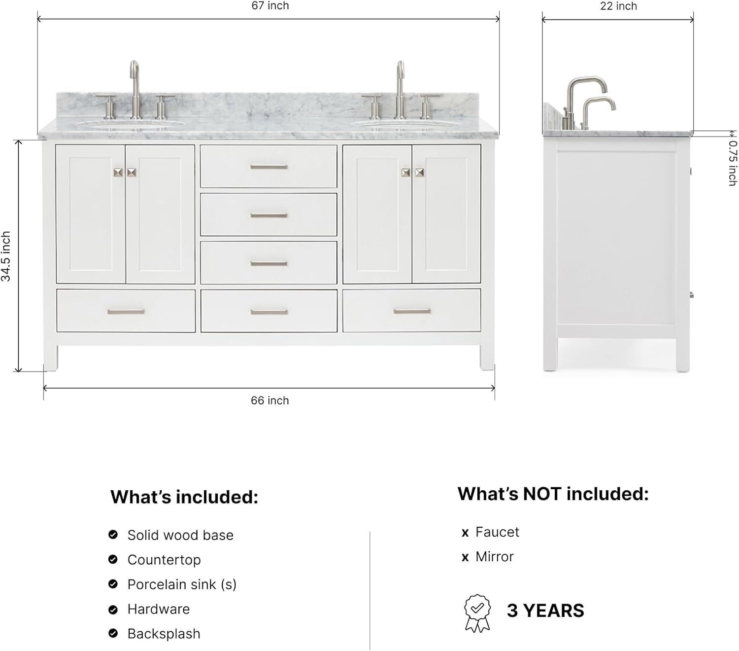 | Included Components | vvanity base cabinet, countertop, sinks, hardware, and backsplash |