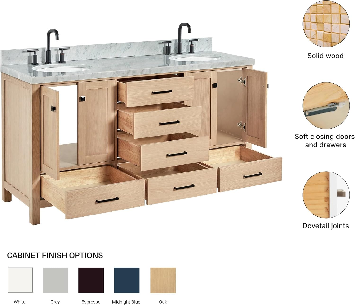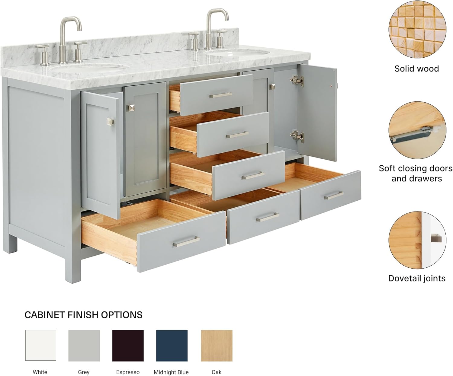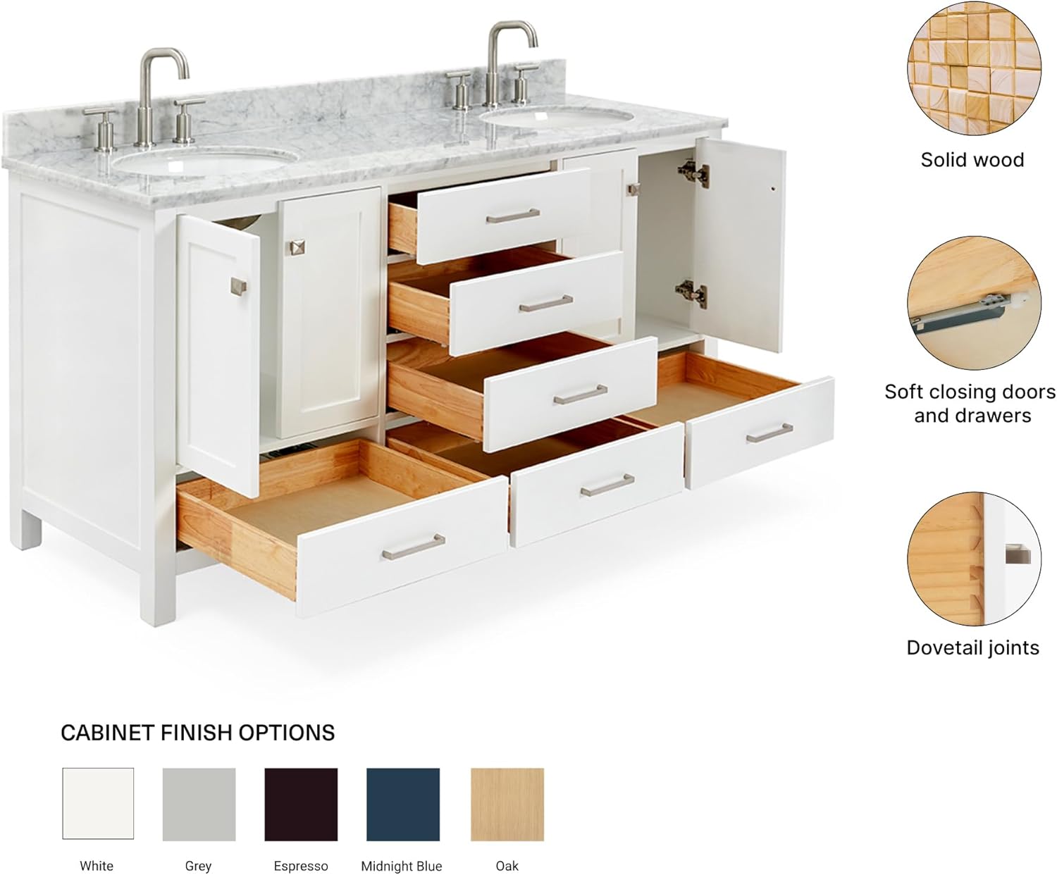 | Additional Features | solid hardwood construction,soft closing doors, soft closing drawers,dovetail jointed drawers,predrilled countertop for 3-hole faucet-8" inch widespread |