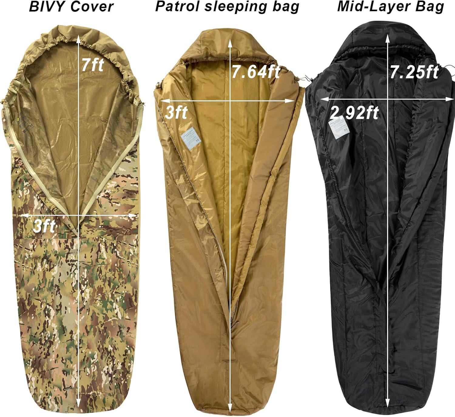 | Included Components | Compression dry bag, Intermediate sleeping bag, Patrol sleeping bag, bivy cover |