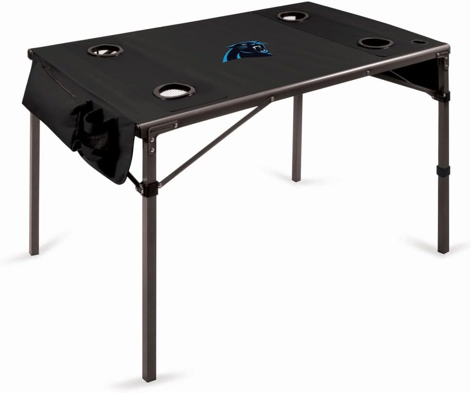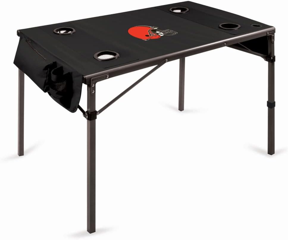 This NFL Travel Table features a portable, folding soft-top design with durable polyester construction, with your favorite team's logo in the center, on a powder-coated steel frame. Perfect for the game room, camping, tailgating, or as a card table, it seats four comfortably and includes four sunken mesh cup holders in the tabletop, plus two more drink pockets; one on each end. The two zippered security pockets add storage to house your personal items such as cell phones, keys, and wallets. The Travel Table comes equipped with matching drawstring carry bag for easy transport and storage. When open, the table measures 42-1/2 long by 27-1/2 wide by 27-1/2 high. Fold it up to a compact 5-1/2 wide by 42-1/2 long, and store it in its carry bag. This handy table makes a great gift! Comes with Picnic Time's Lifetime Limited Warranty.