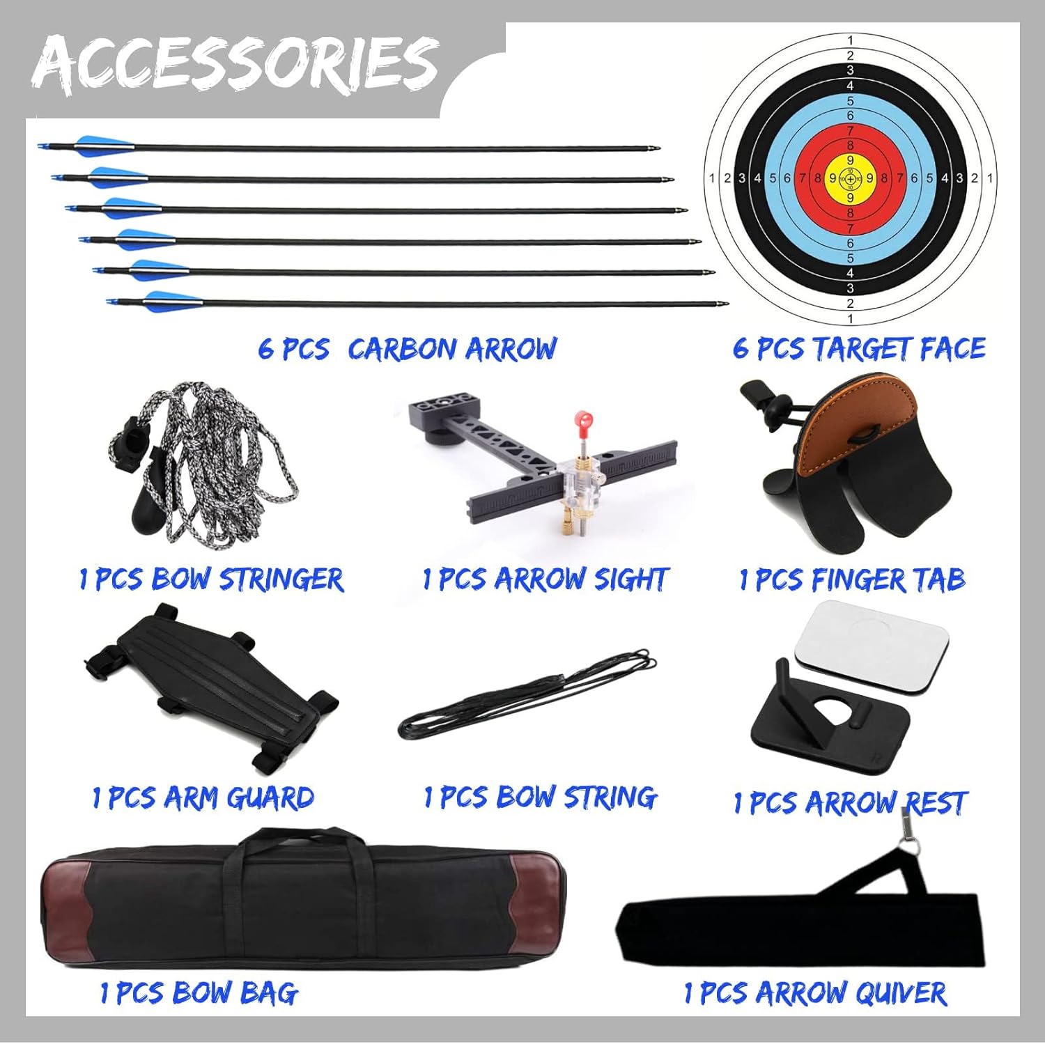 Included Components 6pcs feather carbon arrow, 6pcs target face, arrow rest, finger guard, arm guard, sight, bow string and stringer tool, one arrow quiver and bow storage bag