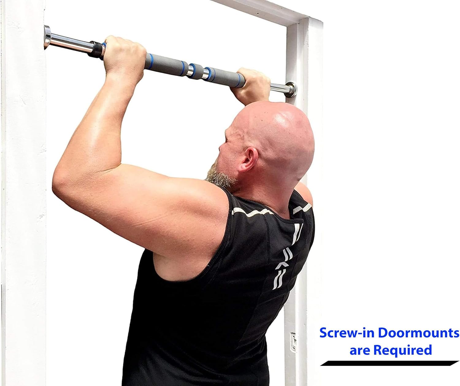 The Maximiza Pull-Up Bar is a perfect addition to any home gym workout for upper-body strength and muscle toning. Its versatile uses include pullups, chinups, hanging leg raises, push-ups, dips, sit-ups and crunches.As you gain strength, it is easy to add more variations and difficulty into your Pull-up Bar exercises. This exercise bar really is the total upper body workout bar.With the Maximiza, you need minimal space in your house to do highly effective bodyweight exercises. The heavy duty chrome steel bar and the multiple screw-in door mounts provide safety and stability while giving you the flexibility to move it to different places or heights. The non-slip extra-long foam grips provide a firm grip and extra comfort to minimize hand fatigue. The Maximiza Pull Up Bars fit standard doorways between 27 and 39 inches wide. They come with 2 sets of heavy-duty and 1 set of medium-duty door mounts which can be screwed into up to 3 wooden doorframes.Mounting Note: Always secure to the doorframe with the provided heavy-duty door-mount set and screws.The maximum installation height and body weight supported will vary depending on each situation including required usage, mounting method and the door frame. We always recommend using the heavy-duty door mounts for pullups and chinups. Maximum weights and heights for typical installations are:1. Heavy-duty door mounts: 300 lbs / 136 kilograms. (recommended)2. Medium-duty door mounts: 150 lbs / 68 kilograms - Do not use above waist height.3. Only to be used without doormounts at low heights for light exercises, e.g. sit-up foot support.Safety Note:Every time before the pull up bar is used, you must cautiously apply your weight to it during the first few exercises to confirm that it is secure and will safely hold your weight.