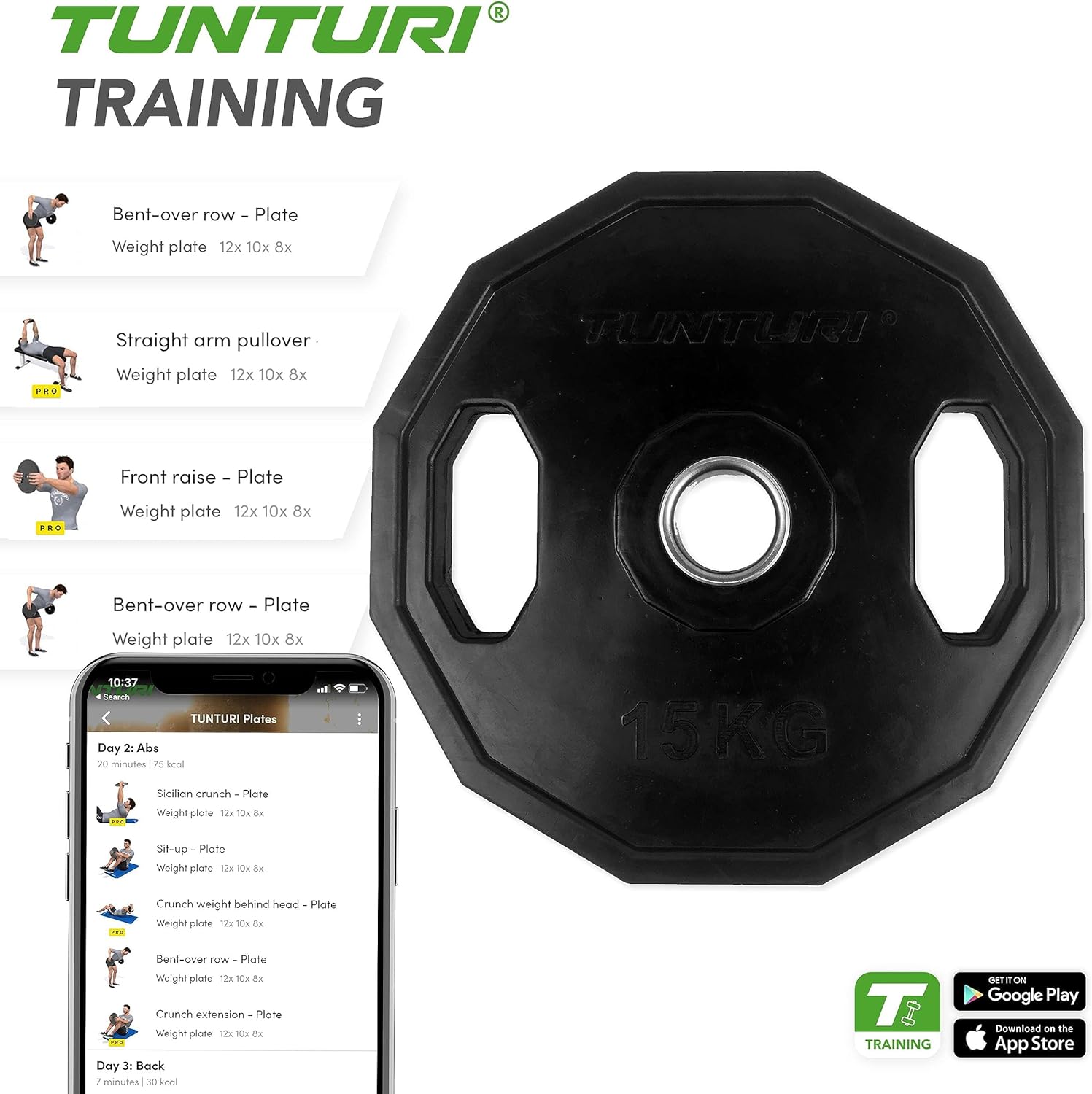 Olympic weight plates the Tunturi Olympic weight plates are made of 100% cast iron. The weight plates have an inside diameter of 50 mm. The plates have a rubber coating to protect the floor. The plates are available in the following weights: 1.25 kg 2.50 kg 5.0 kg 10.0 kg 15.0 kg 20.0 kg 25.0 kg most important features: 50 mm diameter available in various weights