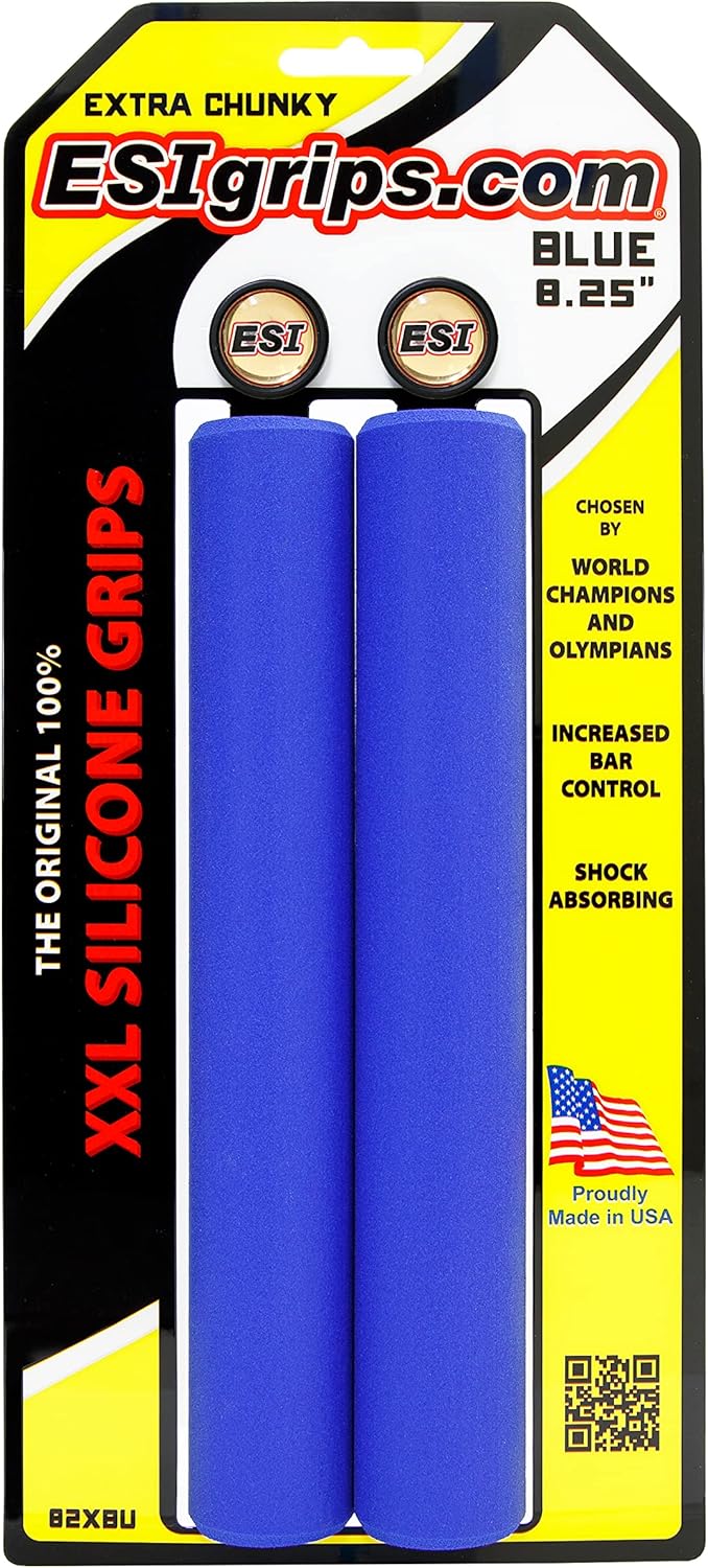 The ESI Grips Extra Chunky XXL is the thickest, longest grip ESI makes. At 8.25 inches long and 34mm installed diameter, it delivers maximum hand coverage and cushioning for riders who want the most comfort and vibration absorption possible. That extra length — over 60% longer than standard ESI Grips — means full bar coverage on wide handlebars with no gaps. The 34mm installed diameter fills your palm completely, making it the go-to choice for long days in the saddle or extended sessions on exercise equipment. The grip is 100% silicone with no latex or rubber, so it's a safe option for anyone with material sensitivities. Silicone maintains a secure, tacky feel in wet or dry conditions and won't crack, dry out, or leave residue on your hands over time. The Extra Chunky XXL works on far more than mountain bikes. Riders use them on touring setups, cruisers, BMX, fixed gear, road drop bars, track and pursuit bars, scooters, strollers, and exercise equipment like Peloton bikes and rowing machines. Any standard 22mm bar is compatible. Each pair is made in the USA and ships with bar plugs included. For the best installation, press the bar plugs in first, then slide the grips on using a little rubbing alcohol or air from a compressor.