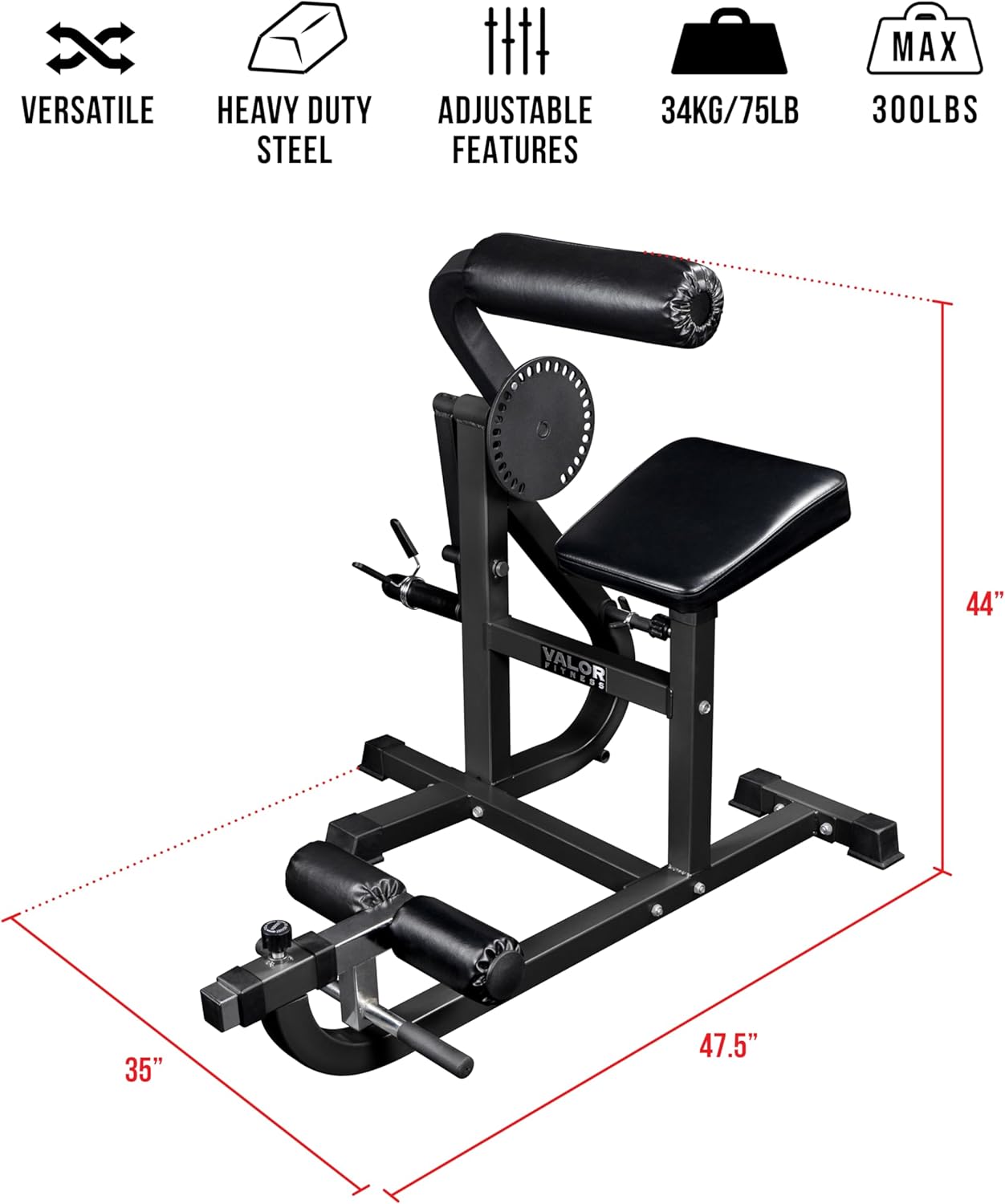 The Valor Fitness Ab crunch and Back Machine is a durable, dual-purpose core trainer built for home gym and light-commercial gyms, designed to strengthen abdominal and lower back muscles for improved posture, stability, and overall performance. Constructed from heavy-duty 12-gauge steel with a 200 lb weight capacity, it features rubber end caps to protect floors and provide stability during use. The adjustable chest pad allows you to switch quickly between ab crunches and back extensions, maximizing efficiency and saving space. High-density padding ensures comfort and proper support during each workout, making it ideal for users of all fitness levels seeking effective, targeted core training.