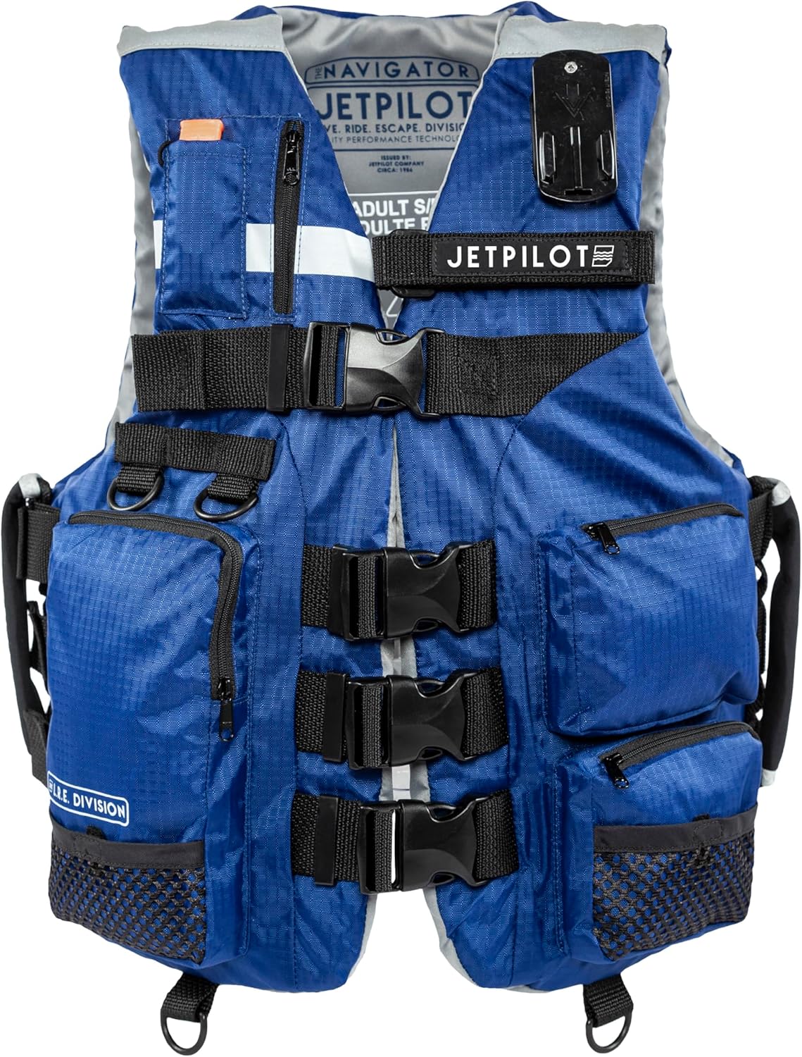 The Navigator Adventure PFD, a feature-loaded water version of a military tactical vest, is built with heavy-duty, lightweight reinforced nylon fabric and a comfortable 4-buckle design, ideal for fishing, long haul tours, kayak trips, or additional safety when reeling in the big fish, featuring a US Coast Guard-approved 4-buckle vest with front-zip entry, Aero-Jet flotation foam, built-in safety whistle pocket, CoPilot side grab handles, removable Action Camera mount, adjustable Velcro radio strap, reflective shoulder/back tape, and built-in utility straps, multi-purpose zipper/mesh pockets, and shoulder straps for unparalleled safety, comfort, and convenience.