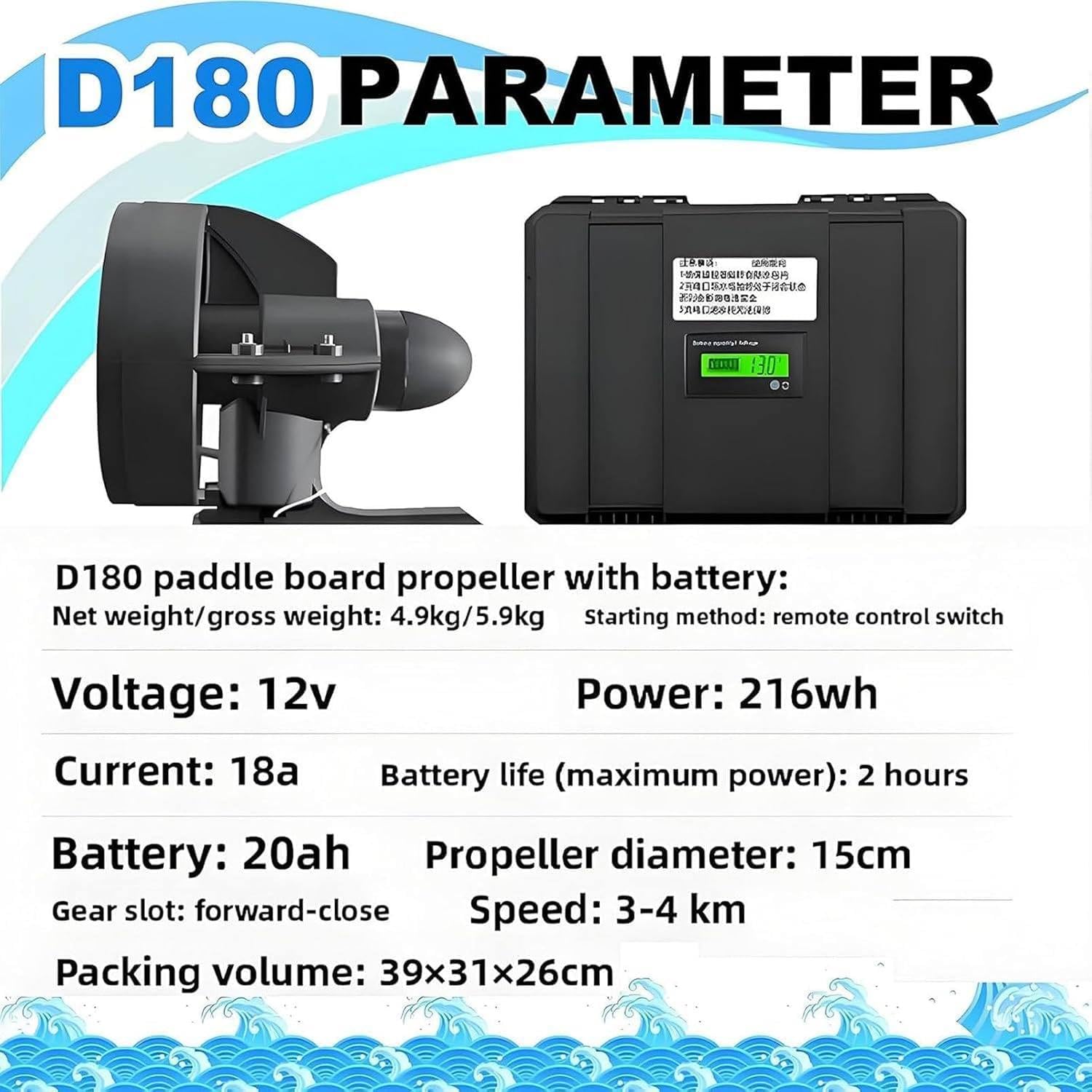 Tired of missing the scenery while paddling due to exhaustion? The underwater propeller fin is your solution to explore further without the need for excessive effort. Simply press to activate the turbine power, extending your journey up to five times. Its folding design allows it to transform into a compact 'water backpack' instantly, perfect for navigating rapids, island hopping, or enjoying sunset cruises.FEATURES1.Waterproof Electric Fin Motor for Paddle Boards.2. with a top speed of over 5 mph.3. Battery lasts up to 2.5 hours at low speeds and up to 45 minutes at high speeds.4. Adapters Can Be Used Separately For Inflatables, Slide-In Fin Boxes Or Flip-Lock Fin Boxes, Adapters For Attaching To Kayaks And Canoes.5. Recreational paddle boards can be used in safe waters for stand up reward paddling, water yoga, family outings.SPECIFICATIONSName:Underwater propeller finStarting method: remote switchPower: 216wh/288whVoltage: 12VCurrent: 18A/24ABattery life (maximum power): 1.5/2 hoursBattery: 20AhPropeller diameter: 15cmGear Options: Forward / OffSpeed: 3-4km/4-5kmNet weight: 4.9KG/5.1kgOccasion: Offshore watersPackage includes:1× Electric thruster fin1× Battery1× Battery pack1× Charger1× Remote control1× Waterproof bagTIPS:1. For optimal performance, fully charge the battery before use. Charging takes approximately 2 hours.2. Ensure the charging port remains closed to prevent battery damage.3. The controller is not waterproof; store it in the provided waterproof bag during use.