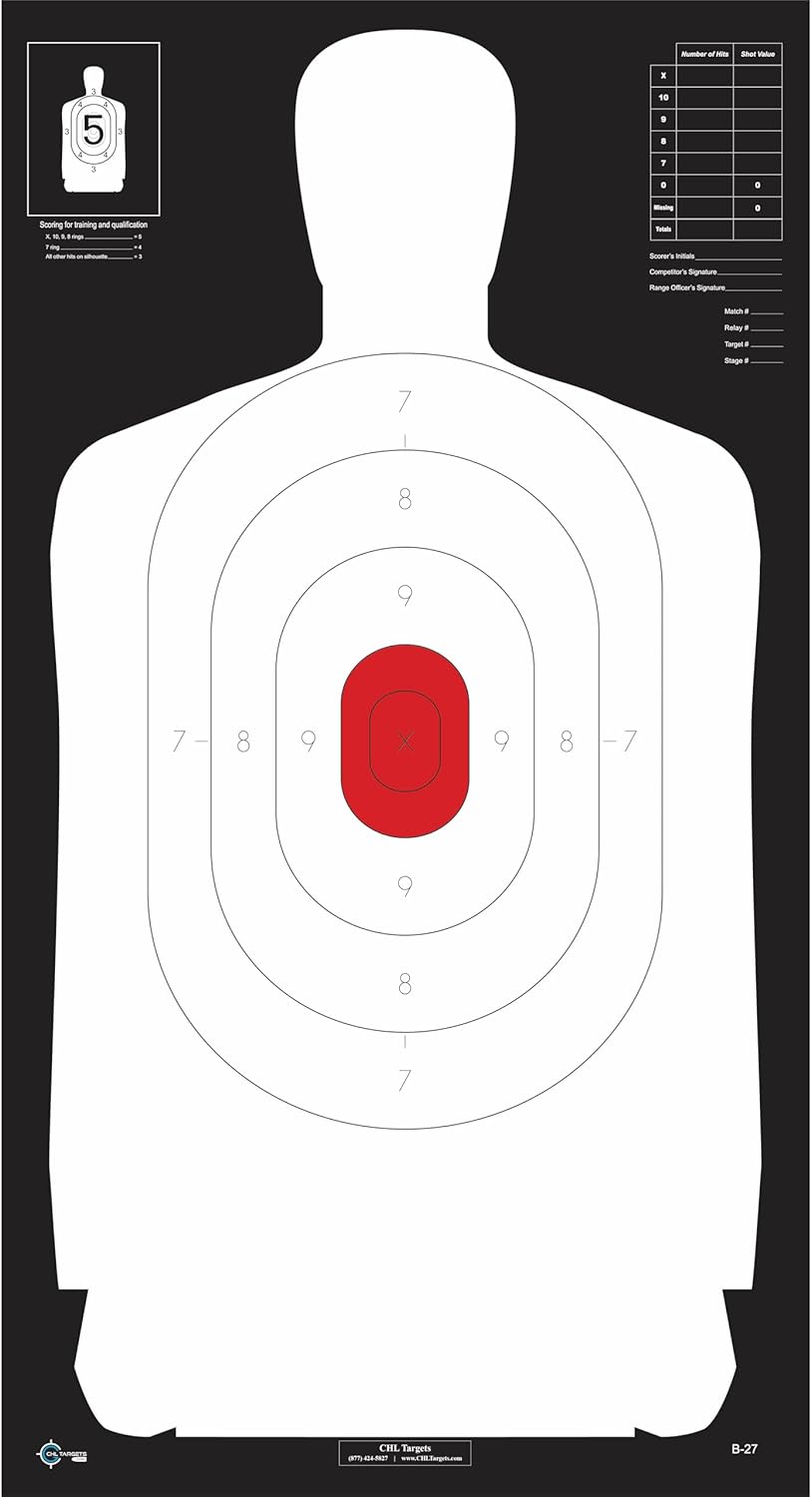 Improve your shooting accuracy with B-27 Silhouette Shooting Targets, the industry-standard target used for law enforcement qualification and handgun training. These full-size silhouette targets feature clearly defined scoring zones that make it easy to track progress and evaluate shooting performance. The realistic human silhouette design helps shooters develop practical defensive skills and improve shot placement. Printed on durable target paper, B-27 targets produce clean, visible hits for quick scoring at both indoor and outdoor ranges. Whether you're training for qualification or improving your shooting skills, these B-27 silhouette targets deliver professional-grade performance.