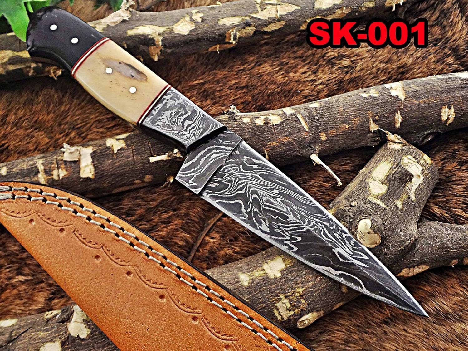Features: Natural Camel bone scale and bull horn scale with Damascus Bolster crafted with red fiber & brass spacer. 4.5" long Scale is bling with 4 silver pins for extra strength. Overall 9" Long with 4.5" long full tang blade. Approximately 5 mm Thick Twist pattern Damascus steel blade. Full tang blades are considered stronger and durable then non full tang Up to standard Skinning and hunting Knife Comes with a fine quality extra thick and robust leather sheath. The sheath has belt inserting loop and can be worn on belt. Blade is made of Damascus steel by forging the 1095 and 15N20 high and low carbon steel Full tang blade goes through all the handle as well in a single piece so full tang blades are durable and stronger than non full tang blades Our Damascus steel is prepared by forging over 465 layer of high carbon and low carbon steel. Blade has been given an excellent heat treatment to get it well hardened Hardness 56 to 58 HRC. If you want more information, OR have queries, please contact us without any hesitation. Tips to Care Damascus knife: Damascus steel as well as 1095 high carbon steel knives are different than some other common steel knives,because of its high carbon content they can be rusted if not care properly. If you have seen rust accidentally then use WD40 to remove it Never store your knife for long time in leather sheath. Leather can absorb water which will rust the knife. Always clean the blade after using and apply oil or wax (please use cooking oil on Chef Knife) before you store it, for its longer life and durability. DISCLAIMER: Our knives are very sharp so open and use them very carefully. We are not responsible for any injuries associated with the use of our knives. Our products are intended for legal use only by responsible buyers. We will not sell our products to anyone under the age of 18.