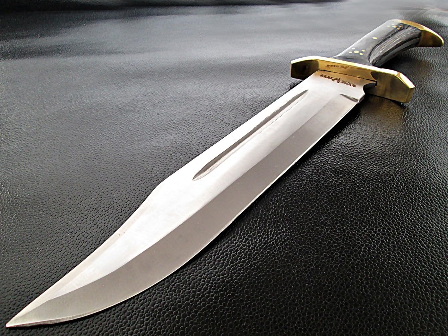 The Extreme Duty XXL Bowie Knife is over 16 inches long with a full tang and the super sharp blade is made of arguably the best knife steel available: Crucible steel. In this case, the type of Japanese CP steel, which is very tough and holds an edge for a long time, plus it is resistant to the elements. This clip point Extreme Duty XXL Bowie Knife has a 11.5 inch long blade capable of spitting logs, making kindling, or even prepparing a fresh bushcraft meal. The guard on this Extreme Duty XXL Bowie Knife is solid brass and fixed to the tang for solid and reliable use out in the wild. The hardwood Ebony finished Pakka wood handle is dark grey or black in color, with plenty of natural wood grain showing. Three brass pins secure the handle grips and tang together. Even the solid brass pommel is pinned to the tang. Specifications Overall Length: 16.6 Inches Blade Length: 11.5 Inches Blade Material: Japanese CP Steel Blade Thickness: 4.75mm Tang: Full Length Steel Tang Sharpness & Functionality: Razor Sharp, Extreme Duty Functional Blade Features: Straitback Bowie, Blood Groove, Clip Point Handle Length: 5.25 Inches Handle: Solid Ebony Pakka Wood, Triple Pin to Tang, Solid Brass Bolster & Guard Other Features: Includes: Genuine Leather Sheath Holster w Snap & Belt Loop