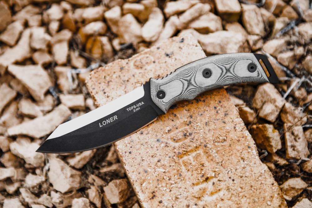 8 7/8" overall. 4 1/4" black traction coated 1095 high carbon steel blade with sharpened top edge. Full tang. Black linen micarta handles. Lanyard. Black Kydex belt clip sheath.
