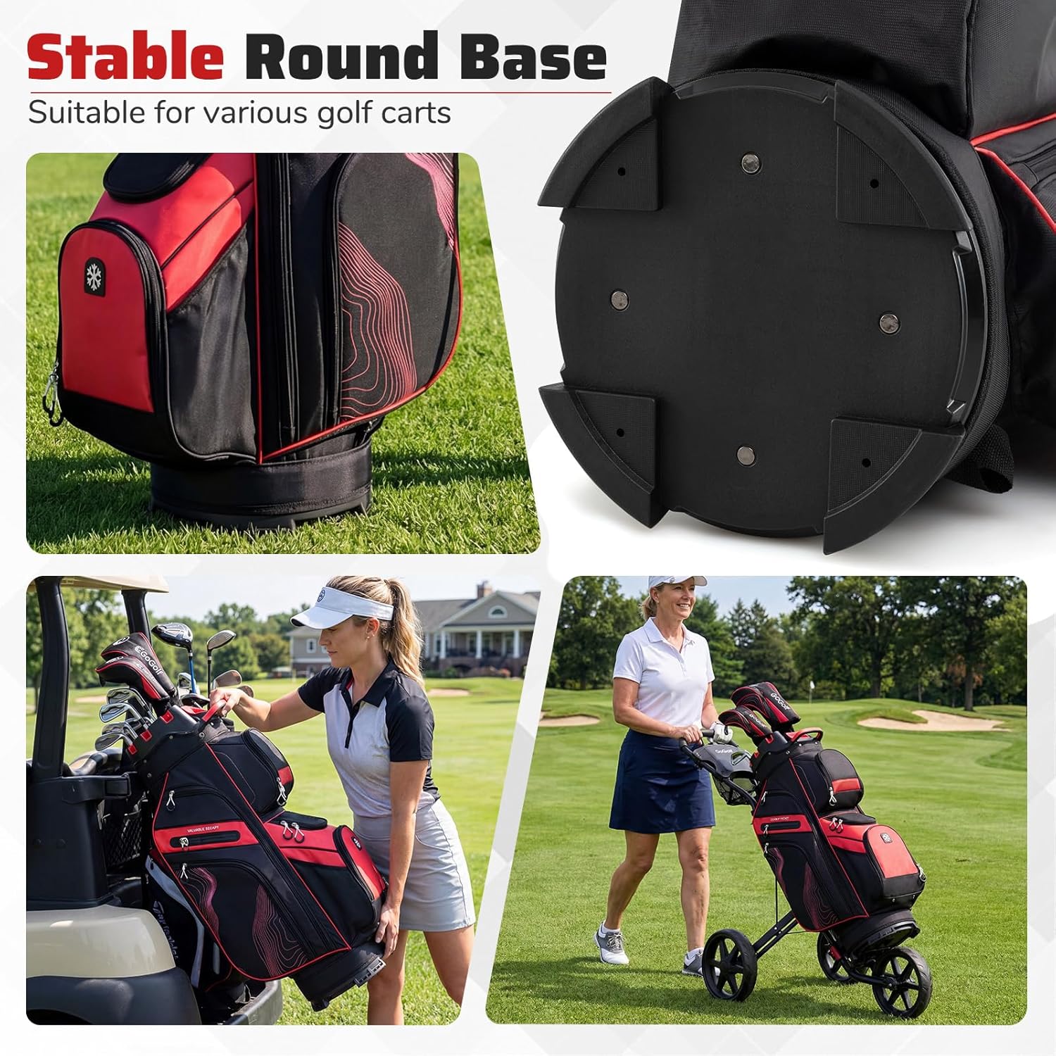 Description:Step onto the green with confidence with this 14-way golf cart bag.Designed with a 14-way molded lock top with full-length dividers, this golf bag offers excellent organization and separation of your clubs, ensuring they are securely held and easy to access. It features a total of 11 pockets, providing ample space for all your essential accessories. These include 2 lined valuables pockets to keep personal items safe and a cooler bag to keep your beverages chilled throughout the day. Crafted to cater to every golfer's needs, this golf club bag is lightweight and comes with a padded strap and multiple handles, making it effortless to carry around the golf course. Additionally, the golf bag includes a towel ring, glove holder, pen pouch, rain hood and umbrella holder for convenient use.Features:14 full-length top dividers with molded locks secure all clubs in place Adjustable padded shoulder strap for comfortable carrying Top handle and non-slip handle for easy transportationRain hood for tidy storage and all-around protection Umbrella holder keeps you prepared for all weather Multiple pockets make storage a breeze 2 soft lined pockets keep valuables well protectedHand y towel ring, glove holder and pen pouchExtra strap organizer helps reduce clutterStable round base prevents tipping overSuitable for various golf cartsSpecification:Color: Black+Red/Black+White/Grey+Dusty Pink/Grey+Navy/Purple+GreyMaterial: Polyester Fabric, PlasticBag Height (with Rain Hood): 50"/127 cm Bag Height (without Rain Hood): 35.5"/90,5 cm Top Dimensions: 13.5" x 9.5"/34 cm x 24 cm (L x W)Base Dimensions: 10.5" x 10.5"/27 cm x 27 cm (L x W)Net Weight: 5.7 lbs/2.6 kgPackage Includes:1 x Golf Cart Bag1 x Rain Hood