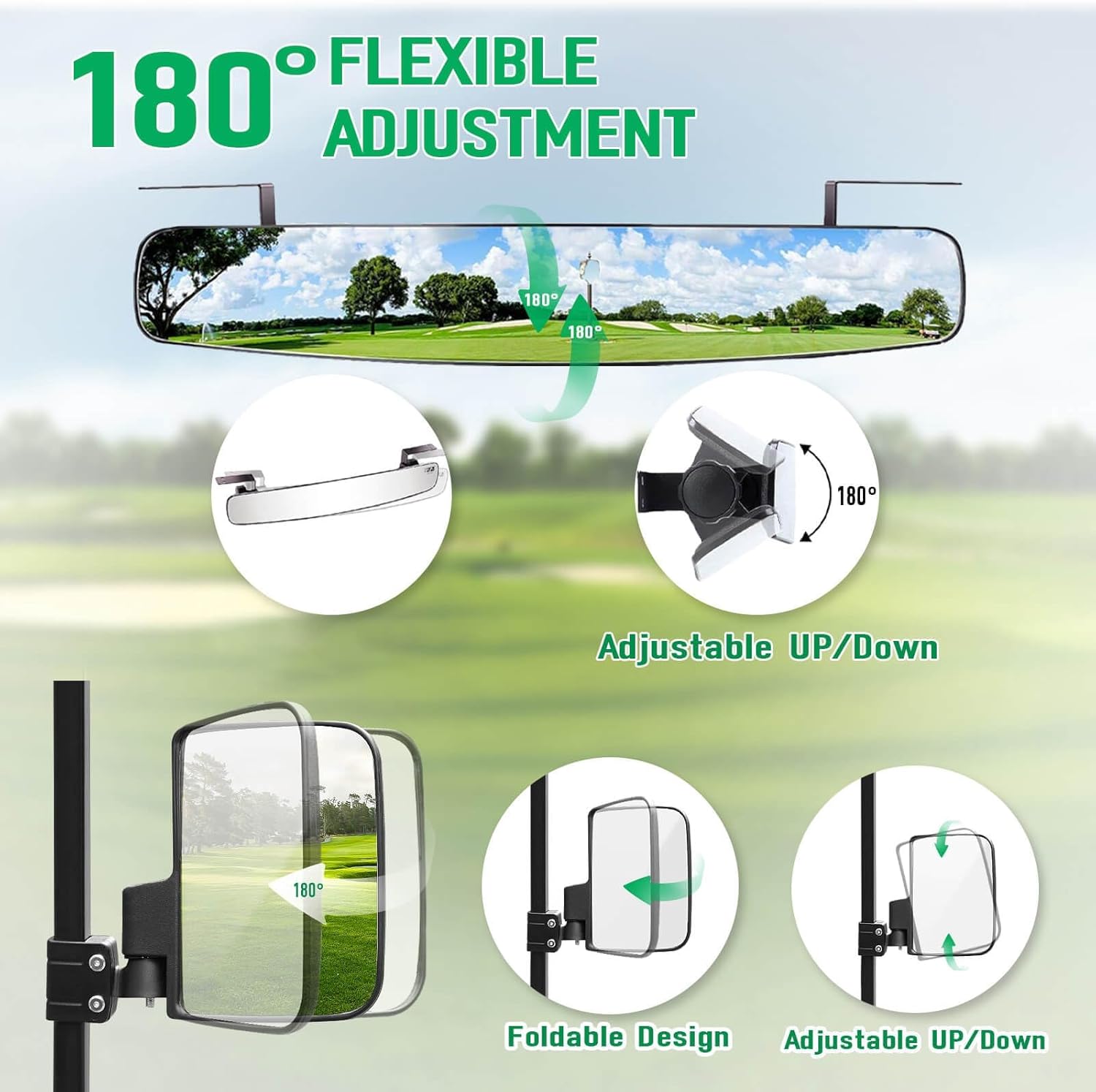 | Included Components | 1*Golf Cart Rear View Mirror, 1*No Drilling Golf Cart Side Mirrors, All Hardwares and Installation Manual |
