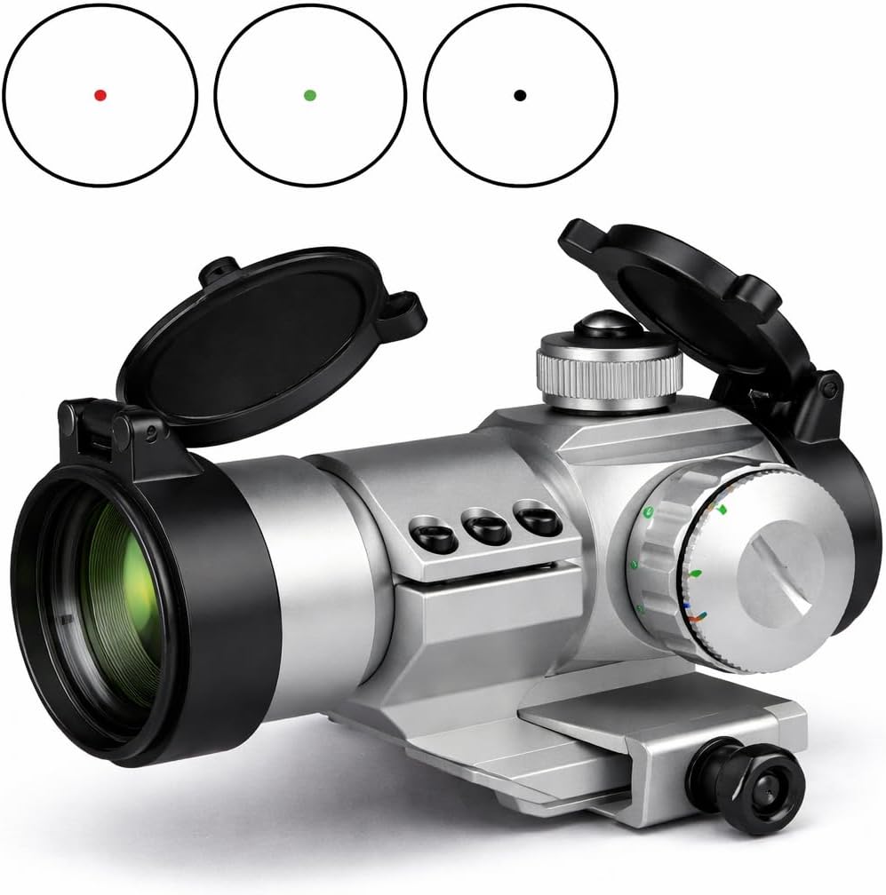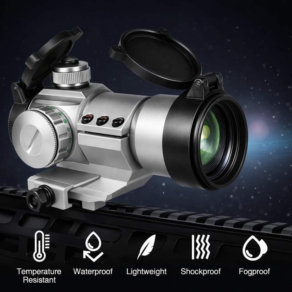 Holographic Reflex Dot Sight with Mount Durable all metal construction Cantilever PEPR mount for any 20mm Picatinny or Weaver rails Quick rail attachment design Allow for precision windage and elevation adjustments Red or green dual illuminated dot reticles with brightness control Fog-poof, weatherproof, and shockproof Removable spring loaded flip lens covers