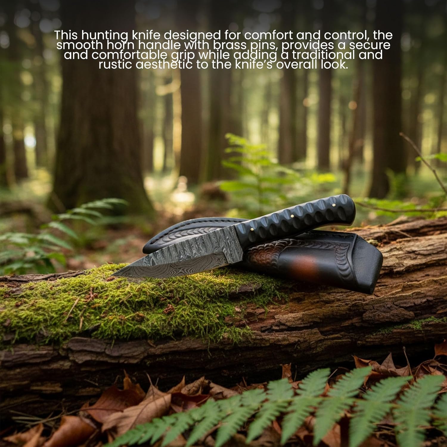 The SZCO Full Tang Skinner Knife 9 Inch is a rugged and stylish shark tooth bowie knife designed for outdoor use. Its Damascus steel blade delivers sharpness, strength, and lasting durability for hunting and camping tasks. The polished horn handle provides a secure, comfortable grip with a natural finish. Perfect for outdoor enthusiasts, this knife performs well as skinning knives for hunting or as part of your camping gear. Inspired by the classic Buck knife design, it offers a balance of beauty and function. A great pocket knife for men who value craftsmanship and performance, it comes with a sheath for safe carrying and easy storage with your favorite knives.