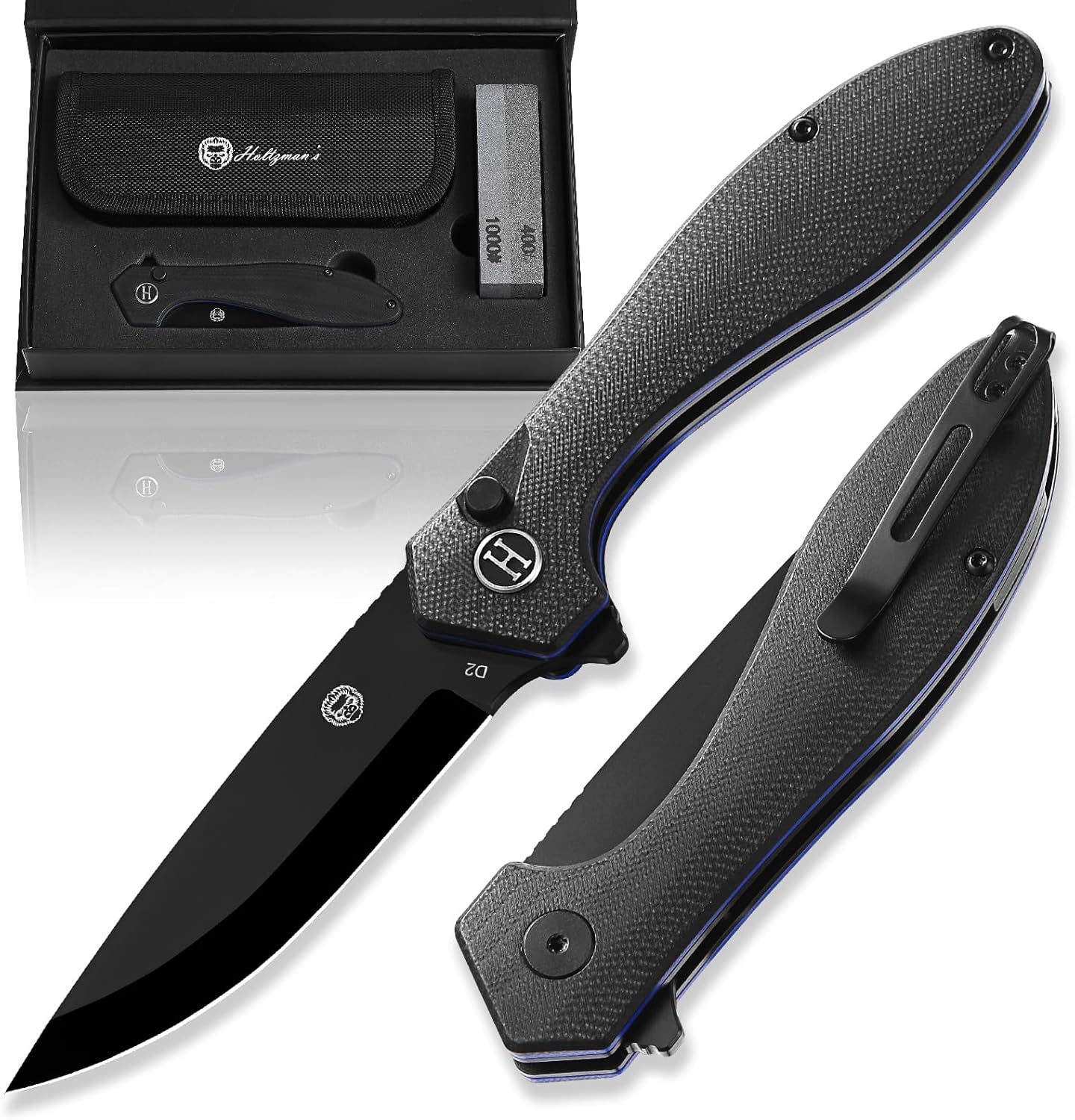With a slightly recurved blade ideal for multitasking, the Holtzman Pocket Knife offers amazing slicing and piercing capabilities good for tackling tough jobs. The same great, useful, powerful blade shape with fierce design offer users consistency and dependability. The pocket knife handle is enhanced to provide Anti-slip & easy grip, it is designed for functionality. The sharpening stone will make sure your blade is always razor sharp and the carrying case will keep your EDC knife safe and always at hand.