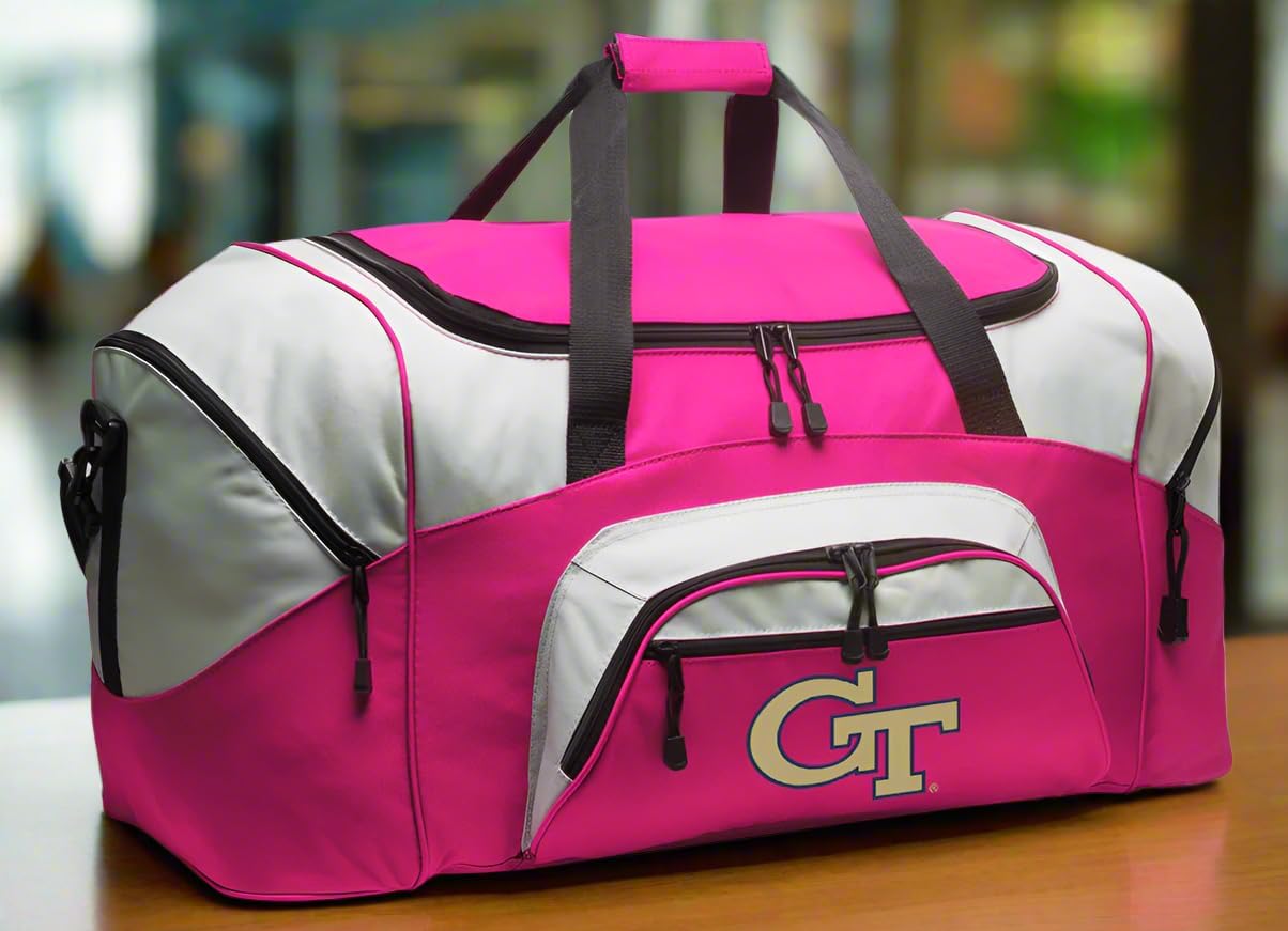 🎀🟡⚫🐝 Georgia Tech Yellow Jackets Women’s Duffel Bag – Pink Edition – Official GT Logo – Stylish Sports, Gym & Travel Gear – Heavy-Duty 600D Polyester – Extra-Large Weekend Duffel – Broad Bay Show your Yellow Jackets pride with a stylish edge! This officially licensed pink Georgia Tech duffel bag featuring the GT logo is designed for women who want a fashionable, durable bag for sports, gym, travel, or game-day. Built tough with heavy-duty 600D polyester canvas and a reinforced base, this versatile duffel combines function with a bold look for GT fans. The wide D-shaped zipper allows quick packing and unpacking. Two large zippered end compartments keep shoes or sports gear separate, while dual front pockets organize accessories and smaller items. With padded handles and an adjustable, removable shoulder strap, this women’s pink duffel is perfect for workouts, weekend trips, or cheering on the Yellow Jackets. A thoughtful gift for female Georgia Tech fans, alumni, athletes, and travelers—with up to 15% of each purchase directly supporting Georgia Tech programs! 📏 Dimensions: 27.25"W × 13.5"D × 12.75"H 🧳 Volume: 4,690 cu in 🛡️ Material: Heavy-Duty 600D Polyester Canvas & Reinforced Base 🎀 Officially Licensed Georgia Tech Gear – Up To 15% Supports University Programs