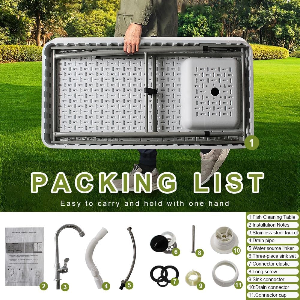 Welcome to LWWJJ StoreMulti-purpose sink table is perfect for picnics, camping, fishing and almost any kind of outdoor activity with family and friendsFeatures:Tabletop station is made of heavy-duty plastic, ideal for prepping meals or cleaning new catchesSink features a stainless steel faucet that also has a garden hose hook up for water accessDesigned with foldable legs for easy storage and mobilityOverall dimensions: 46"(L) x 24"(W) x 37"(H); Sink Dimensions: 10"(L) x 15"(W) x 3"(depth)Specifications:Overall Dimensions: (45.28 x 37.20 x 23.23)" / (115 x 94.5 x 59)cm (L x W x H)Tabletop Measures Thickness: 2.56" / 6.5cmTube Size: 25*1.0mmProduct Dimensions: 9.15"D x 17.83"W x 14.65"HSink Dimensions: (10 x 15 x 3)" / (25.4 x 38.1 x 7.62)cm (L x W x D)Material: Powder Coated steel Frame & HDPE Table TopColor: WhitePackage Includes:1 x Folding Fish Cutting Table