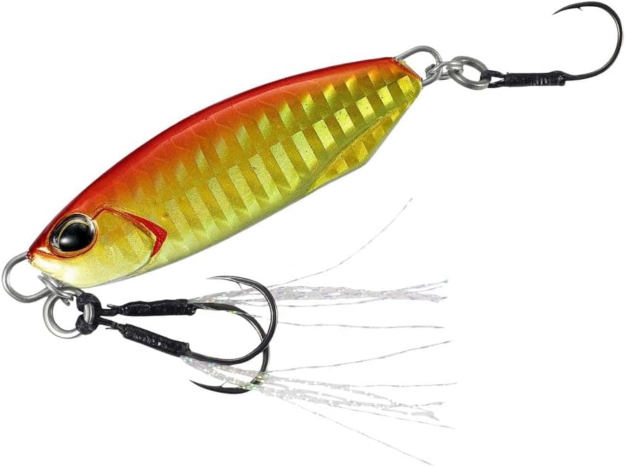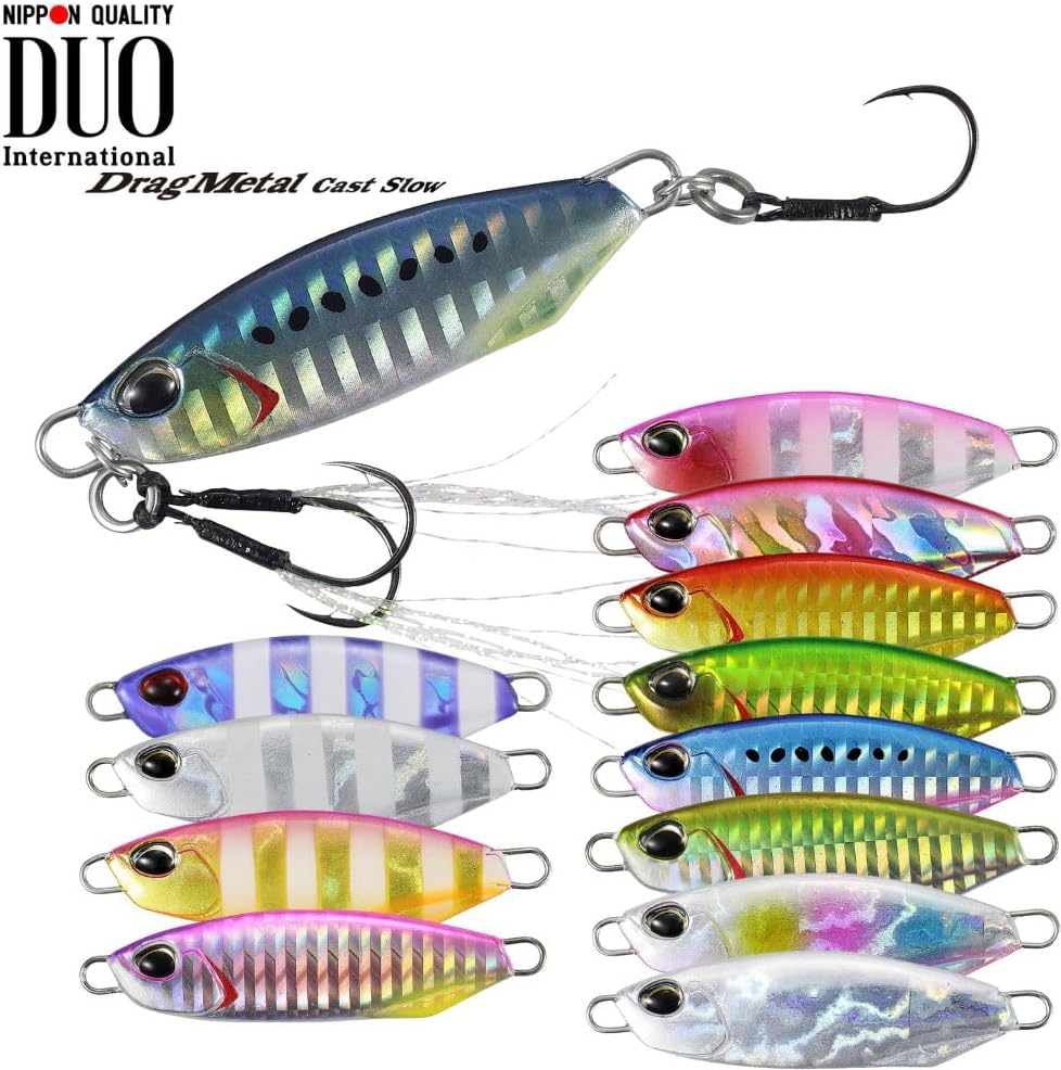 Introducing the Drag Metal Cast Slow, the ultimate answer to shore jigging from DUO. Slow jigging has become a highly productive method for catching various species, and this lure has been carefully developed to maximize its effectiveness. The Drag Metal Cast Slow features an asymmetrical flat side of the body, which creates a short pitched fluttering during the fall. This gives fish a brief but crucial opportunity to bite, while reducing drag against the lure, making it easier for anglers to fish all day long. Despite its asymmetrical design, this lure offers outstanding casting distance, thanks to its subtle weight balance distribution. You can cast it with confidence, knowing that it will reach those hard-to-reach spots. To minimize snags, the Drag Metal Cast Slow is equipped with two assist hooks on the front, complete with tinsels, and one assist hook at the rear. This ensures a higher chance of hooking onto your target fish. Available in four sizes - 15g, 20g, 30g, and 40g - you can choose the perfect weight for your fishing needs. Each lure is made in Japan and manufactured by DUO, a trusted brand known for their high-quality fishing gear. Don't miss out on the opportunity to enhance your slow jigging experience with the Drag Metal Cast Slow. Order yours today in the stunning PHA0055 Green Gold color.