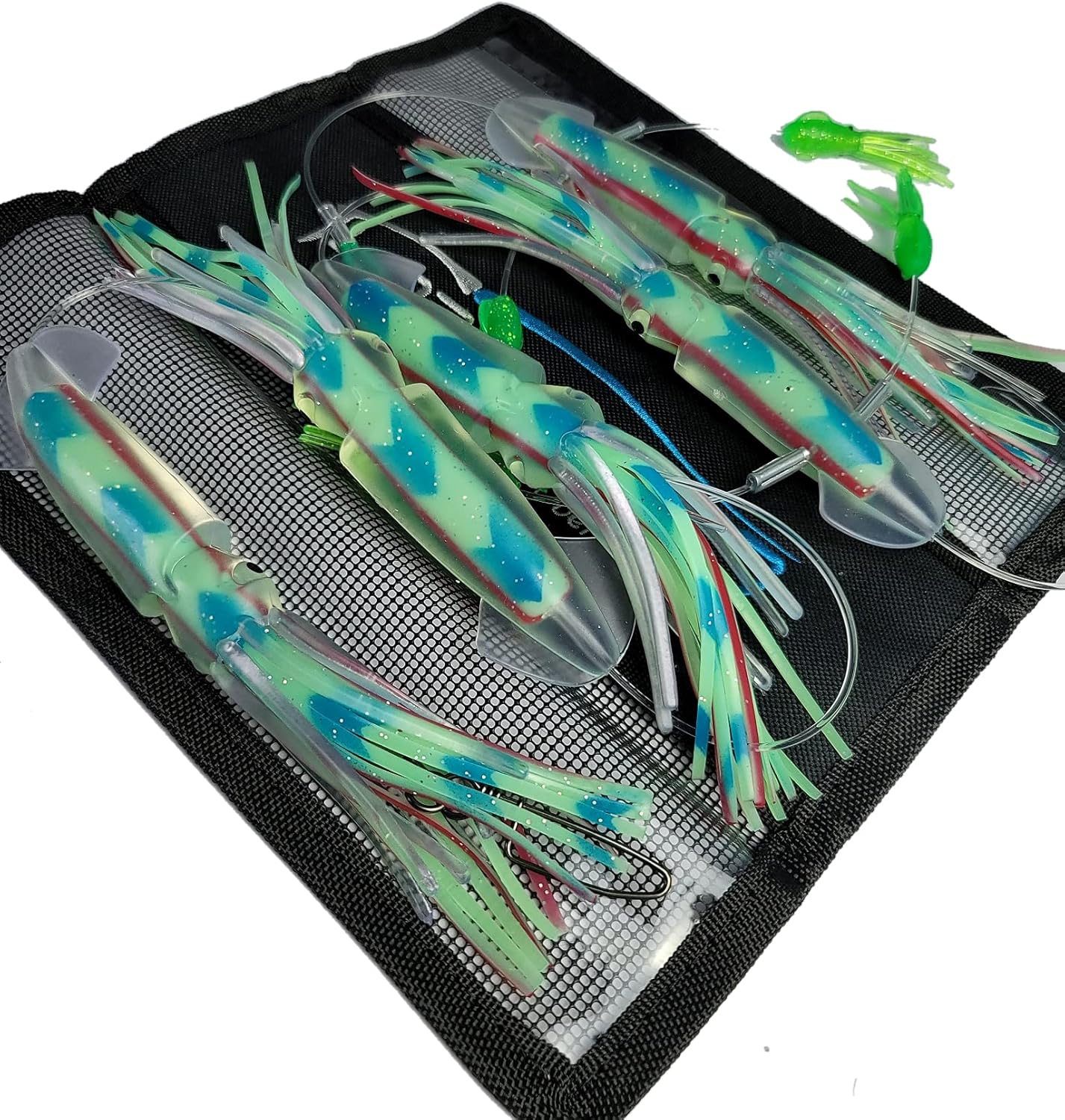 SquidNation Squidnation Pakula 8 Game Fish Flippy Floppy Fishing Daisy Chain Tuna & Marlin is a daisy chain depicting a critter scattering a bunch of bait in the air. Made using the Long Tail 8 Squids. Lumo and Brad J are Glow Made in the USA with Global Components