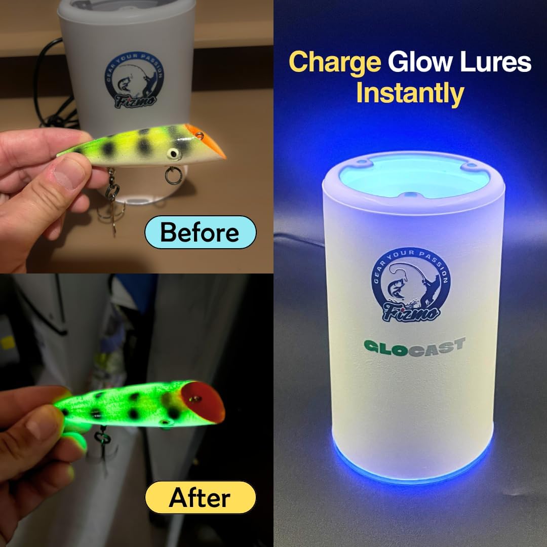 Ready to Land That Trophy Catch? GloCast is Fizmo’s patent-pending UV charger for glow lures, jigs, baits, spoons, and plugs. It’s your secret weapon for a brighter, longer-lasting glow—perfect for turning strikes into story-worthy catches. The Ultimate Tackle Upgrade for Serious Anglers Whether you’re fishing at night, dawn, dusk, in murky waters, or on cloudy days—GloCast is the must-have tool in your tackle bag. This UV Light charger fires up your glow baits, making ’em pop when the bite window’s hot and the water’s dark. Flip the switch on a feeding frenzy with GloCast. Why Anglers Love GloCast >Spend More Time Fishing, Less Prepping – eliminates sunlight “soak” and flashlight juggling, two frustrations veteran captains call out repeatedly. >5-Second UV Blast – delivers a 360° charge for lures, plugs, jigs and spoons in as little as 5 s. Exactly the “sweet-spot” wavelength independent tests recommend for most effective charge. >Glow That Survives the Whole Pass – anglers report a single quick UV hit keeps lures visible to fish for the typical 10-15 min trolling/casting cycle before you reset lines. Own Night, Dawn, Dusk, Cloudy Days, Murky Waters & Deep Fishing – stronger glow means more strikes when natural light and red/orange wavelengths vanish at depth or low light conditions. >Fresh & Salt Water — charges all types of glow lures, including Moonshine, Lyman, Krome Seeker, Silver Fox, etc. >Fits Up to 6 in × 2.8 in (15 cm × 7 cm) – roomy enough for Magnum salmon spoons yet compact for vest pockets. >Rack design lets you hang multiple lures at once for uniform 360° exposure—no more one-at-a-time fumbling. >Sealed, Splash-Resistant Housing – UV LEDs sit behind a snag-proof shield; water-resistant shell self-drains after spray or rain. >Hands-Free Operation – Continuous On/Off switch. Press once, free your hands; no trigger to hold during wild runs. >USB-Powered 5 V – run it from any power bank, boat USB panel or portable battery so you’re never hunting AAAs on the water. >Ultra-Compact Footprint – roughly coffee-mug size (≈ 6 in × 3 in cup shown in comparable products) slips into a boat’s cupholder or mounts to a rail in seconds. When you own GloCast, you’re not simply enhancing your tackle—you’re elevating your entire fishing experience to a new level. Impress your fishing buddies, turn heads on the water, and reel in bigger catches with a glow that outlasts the competition. Join thousands of anglers who have already discovered the difference a brighter lure can make. Step up your game, embrace the thrill of landing that trophy fish, and trust GloCast to illuminate every opportunity. Product Details -For Lures Up To: 6″ x 2.8″ (15 cm x 7 cm) -Continuous On/Off Switch: No need to hold down a button -Dimensions & Weight: 6″ x 3.25″ (15.5 cm x 9.2 cm), 286 g -Includes: 1×GloCast, 1×Wall Mount Bracket, 1×Velcro Strap, 1×User Manual Warning: -Ultraviolet (UV) light. Do not looks directly into the UV LEDs while in operation. May cause eye or skin irritation. Use only as directed. -Use only with a 5V DC power supply. Do not modify. -Not a toy. Keep out of reach of children. Adult use only. -For use in charging fishing lures only. Not for medical or cosmetic applications. Disclaimer: Always follow manufacturer's instructions. Improper use may result in damage or injury. The manufacturer is not liable for misuse of the this product.