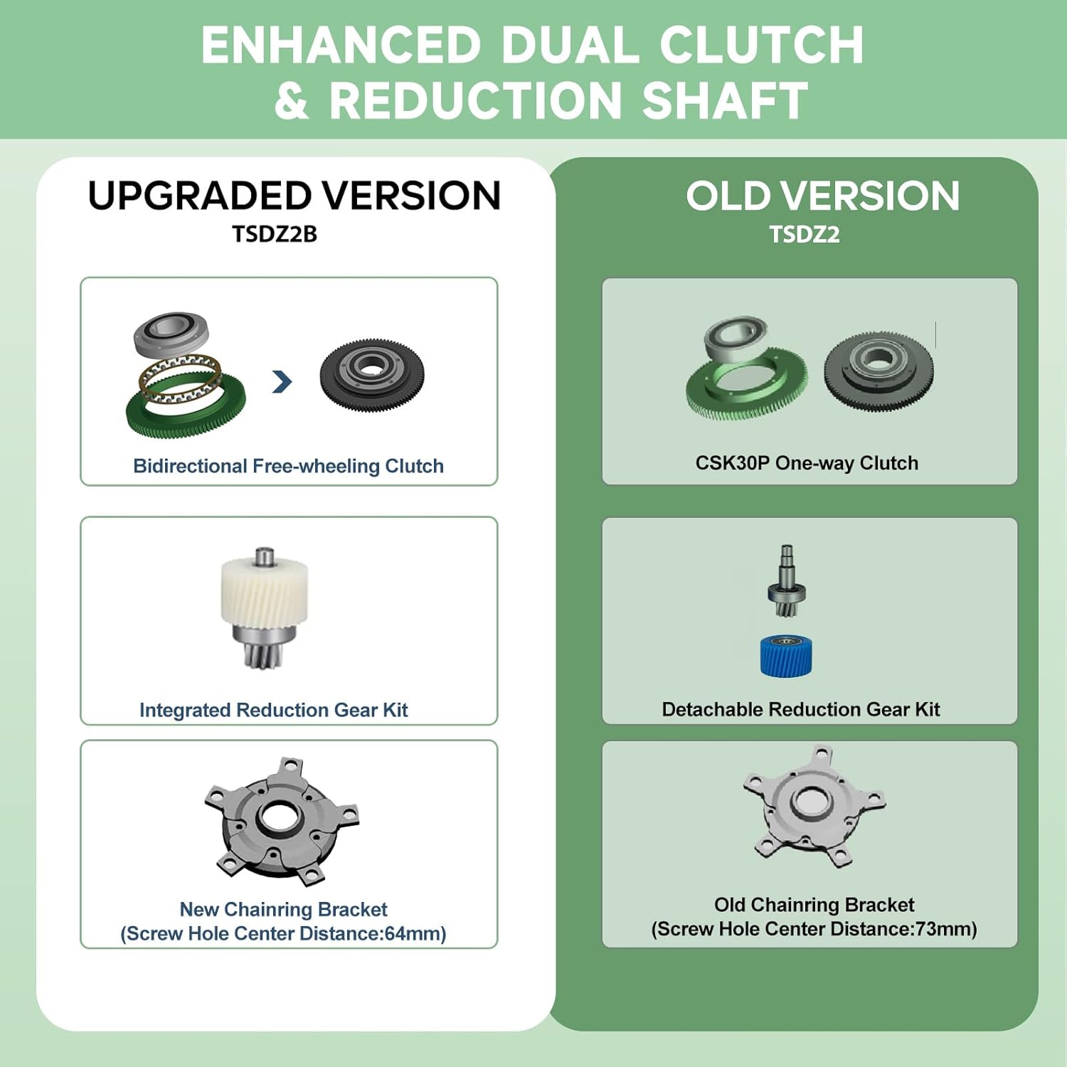 Flagship Powerhouse:48V 500W brushless motor (720W peak) with massive 80Nm torque, effortlessly tackles 15% inclines and heavy cargo loads – perfect for mountain trails/urban commuting All-Weather Warrior:IPX5 certified waterproof housing withstands heavy rain/snow, operates flawlessly from -20℃ to 45℃ (-4°F to 113°F) – built for year-round adventures Smart Torque Sensing:Advanced 5-point cadence detection delivers 0.1s instant response, mimics natural pedaling feel with 90%+ energy efficiency (vs 60% on basic cadence sensors) Universal Compatibility:Fits 68-73mm standard bottom brackets, converts 90% of mountain/road/cargo bikes to eBike.EKD01 Multi-Function Display:5 assist levels + walk mode, real-time tracking of speed/range/power usage, customizable backlight for night rides [Product Description]--- Professional Mid-Drive Conversion Solution:Engineered for cyclists seeking natural riding dynamics, the TS-DZ*2B features dual-sealed industrial bearings and hardened steel gears achieving 98% transmission efficiency. Its proprietary torque-sensing algorithm auto-adjusts power output based on terrain – 30% more efficient than speed-based systems. Technical Specs:1. Rated Power: 500W Continuous (720W Peak) 2. Max Torque: 80Nm @ 75 RPM 3. Battery Requirement: 48V Li-ion (Optional) 4. Crankset: CNC 42T Aluminum ChainringPackage Includes:TS-DZ*2B Mid-Drive Motor Unit ×1 EKD01 LCD Display ×1 Waterproof Wiring Harness ×1 Set Full Installation Kit (spacers/crank puller/BB tools) Motor-Cutoff Brake Levers ×1 Pair or Universal Brake Sensors ×2