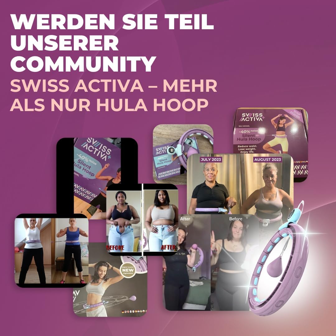 Lose weight and tone your body while having fun! The Swiss Activa+ Smart Hula Hoop is the easiest way to shape and tone your waistline in a fun way. Specially designed to never fall off, our Inifinity Hula Hoop is the ideal fitness home gym accessory for those who want to tone their abs, improve coordination and strengthen their muscles. And this is also the best exercise hula hoops for women to achieve the goal of weight loss. Thanks to the massaging heads on the inside of the hula hoop, you can stimulate your circulation and lymphatic system. In simple terms: less swelling, less cellulite, but also smoother, firmer skin. How to use the Swiss Activa+ Smart Hula Hoop in 3 easy steps Position the fitness hoop at waist level. Take the rubber ball in your hand and throw it horizontally in a clockwise or counter-clockwise direction to start the rotating movement. Stand in a comfortable position with your legs slightly apart and follow the ball with a rolling movement of your pelvis. Reach your goals with the integrated counter the counter of this fitness hoolahoop is not only a timer that helps you monitor your workout times but also a calorie counter and a lap counter. In this way, every day you can set a daily goal and reach it without excuses. In fact, training with the hula hoop is the best home workout equipment for women. With the ability lose weight and it only takes 30 minutes a day to burn calories while having the time of your life!